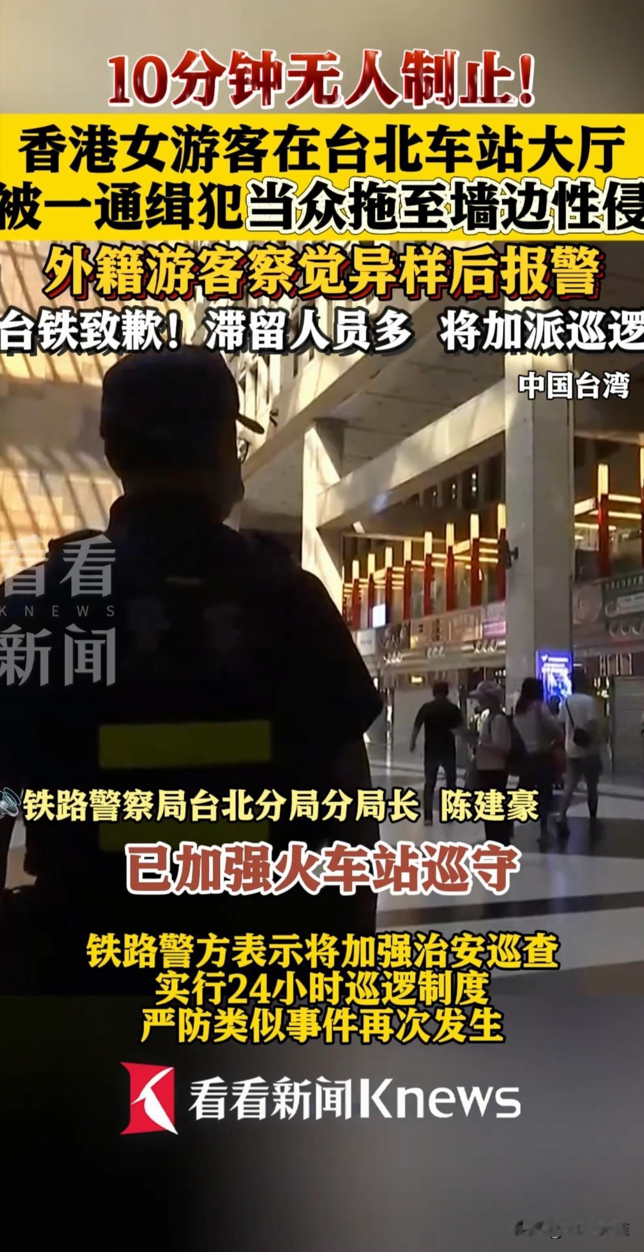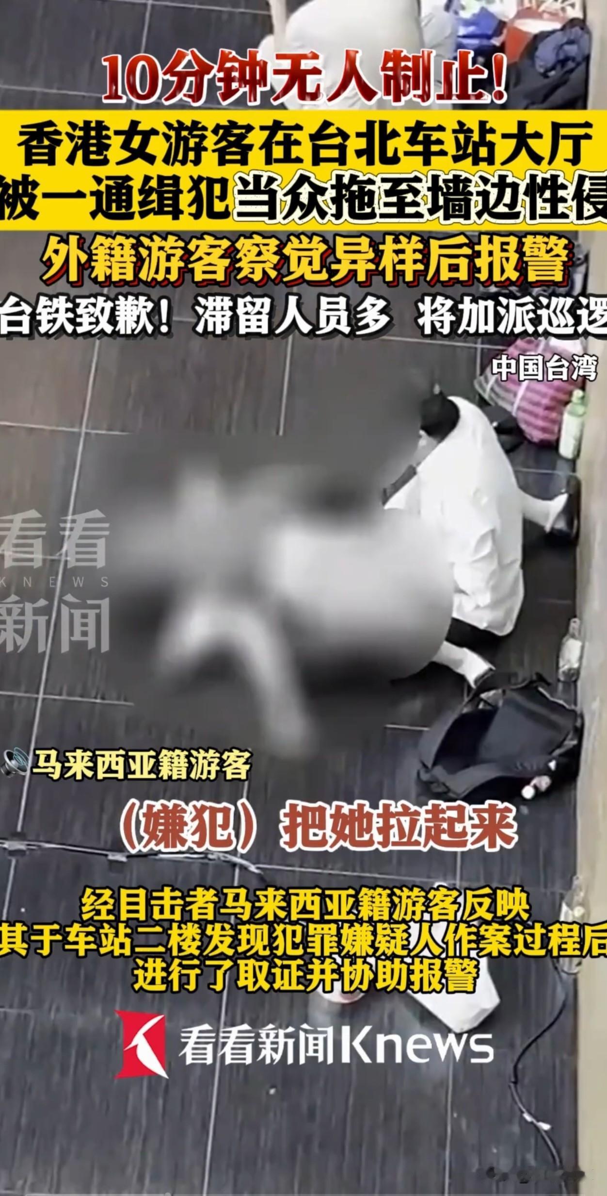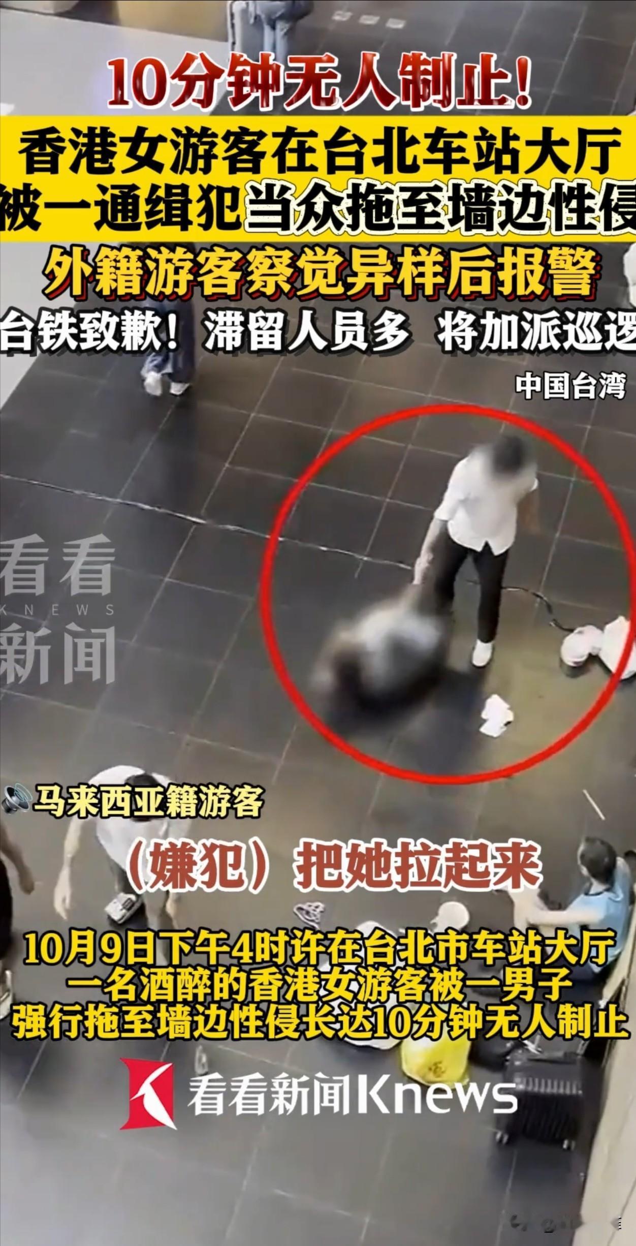 香港女游客醉酒,躺在台北车站大厅地上,被一名男子拖到墙边,侵犯了10多分钟,期间无人制止,直到一外籍游客发现异常报了警。车站致歉:滞留人员多,将加强巡逻。 中国台湾,男子是一个有盗窃前科,还在被通缉的通缉犯,他看女子没反抗能力,直接抓住她的手,把人从大厅中间拖到墙边,当众就开始侵犯。 让人寒心的是,暴行持续了10多分钟,监控里能看到近20个旅客从旁边经过,却没一个人站出来。 后来那个报警的马来西亚籍学生说,他当时在二楼等朋友,本来以为这么多人肯定会有人先出手,结果等了好久都是一片沉默,特别意外。 直到这个马来西亚学生和朋友汇合,两人赶紧拍下视频留证据,然后报了警。最后警察赶来才救下女游客,当场抓住了男子。 女游客醒酒后才知道自己被侵犯,现在已经去医院验伤,准备告那个男的。 事后车站致歉,表示很遗憾,会加强巡逻,及时反应旅客异常情况。 有网友表示,旁观者即使不敢直接上前制止,大声呼救或报警总是可以做到的,这种冷漠的态度让受害者在最需要帮助的时候孤立无援。 也有网友对车站的安保措施和管理提出质疑,事后车站虽然推出了一系列整改措施,但还是有不少人表示担忧。