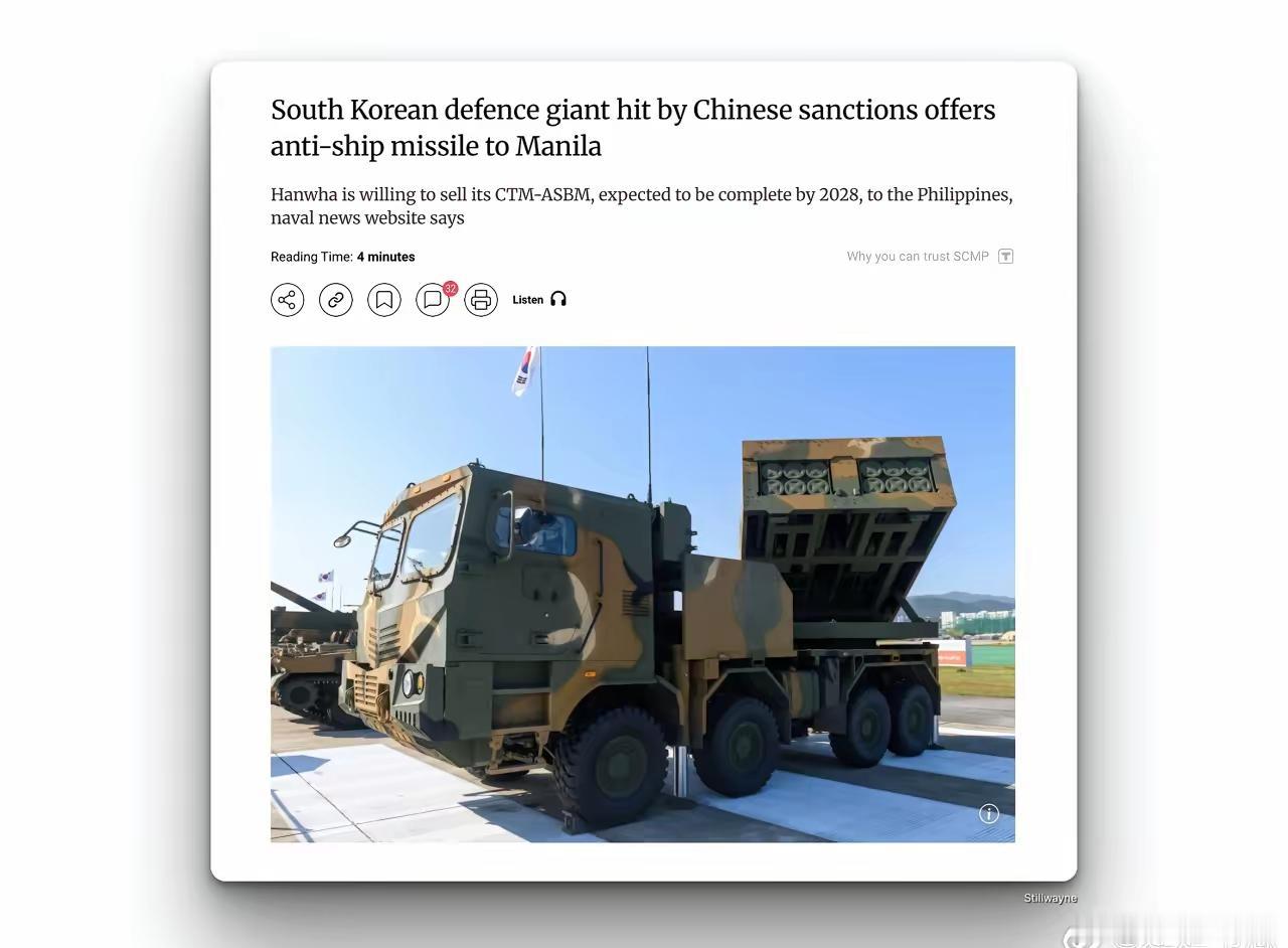 被中国制裁的韩国国防巨头韩华集团愿意向菲律宾出售其CTM-ASBM导弹 分析人士称,在北京对韩国造船业实施制裁的同时,韩国国防巨头韩华集团提出向菲律宾出售反舰导弹,这表明韩国选择倾向于与美国及其盟友开展国防工业合作。 这话戳破了韩华集团的真实算盘,更暴露了韩国在中美之间的战略摇摆。谁都清楚,韩华刚因协助美国打压中国海事领域,被中方用《反外国制裁法》精准“点名”——旗下5家美国子公司不仅被禁购船用钢板、柴油机等核心部件,连船舶靠泊中国港口都成了难题,一天之内市值就蒸发126亿元人民币。前脚刚因“助美反华”吃了制裁苦果,后脚就忙着给美国的亚太盟友送导弹,这哪是单纯的商业行为?分明是选边站队的明确表态。 韩华要卖的CTM-ASBM导弹可不是普通装备。这款在原有型号基础上升级的反舰弹道导弹,射程能到160公里,配备的专用导引头能精准锁定海上目标,圆概率误差甚至只有9米[__LINK_ICON]。更关键的是它能直接整合到现有多管火箭系统里,对海岸线漫长的菲律宾来说,确实是款“性价比很高”的武器。但菲律宾真能靠这导弹获得安全感?恐怕未必。看看菲律宾之前的军购就知道,连F-16都买不起,最终选了韩国FA-50战机,本质上就是被“低价诱饵”吸引,这次买导弹大概率还是延续了这种被动选择。 背后的美国身影更是藏都藏不住。韩国与菲律宾的军事合作从来都不是“双边交易”,从美国私募收购苏比克造船厂再租给韩国企业,到计划建全球最大预置仓库,每一步都踩着美国的印太战略节奏。韩华卖导弹看似是自己开拓市场,实则是帮美国补全南海军事围堵的拼图——让菲律宾手握反舰导弹,就能在南海问题上更有底气牵制中国,美国坐收渔利,韩华则赚得盆满钵满。这种“借他人之手施压”的套路,美国在亚太用了不止一次。 最讽刺的是韩华的双重标准。一边在中国市场赚着28%的营收,拿着35亿美元的船舶订单,另一边却通过美国子公司给美军造濒海战斗舰,还明确拒绝转让同类技术给中国。被制裁后嘴上喊着“重视中韩经贸关系”,紧急启动沟通渠道求磋商,行动上却转头向菲律宾兜售武器,这种“一边求和一边递刀”的操作,只会让自己的信誉彻底破产。要知道,中方的制裁可是“穿透式管控”,连12家关联企业都被波及,通关时间从24小时延长到72小时,韩华的运营成本早已大幅飙升。 韩国的战略困境也在这波操作里暴露无遗。李在明政府收到制裁令当天就慌了神,把经济会议临时改成应对会议,延长了整整两小时,显然清楚对华合作的重要性。但为了维系美韩同盟,又不得不配合美国的地缘布局,这种“两头讨好”的想法终究是幻想。就像有分析指出的,韩国帮美国在菲律宾搭建军事支撑点,自己只赚点技术和供应链的小钱,却要承担与中国关系恶化的巨大风险,这笔账怎么算都不划算。 韩华卖导弹的举动,本质上是用短期利益赌长期战略。可军事合作从来都是把双刃剑,菲律宾一旦把这些导弹部署在南海周边,只会加剧区域紧张。而韩华自己呢?如果继续抱着“助美反华”的心态,就算能从菲律宾赚点导弹钱,也补不上中国市场的巨额损失。毕竟制裁清单上的每一项限制,都精准打在韩华的产业链命门上,真要走到技术合作终止、订单违约的地步,可不是卖几枚导弹能挽回的。 这场看似简单的军售背后,藏着的是小国在大国博弈中的无奈与投机。但历史早就证明,靠押注单边阵营谋利的行为,最终只会引火烧身。韩华现在要做的,不是忙着给别人递武器,而是先想明白:到底是中国市场的稳定订单重要,还是美国阵营的短期甜头靠谱。