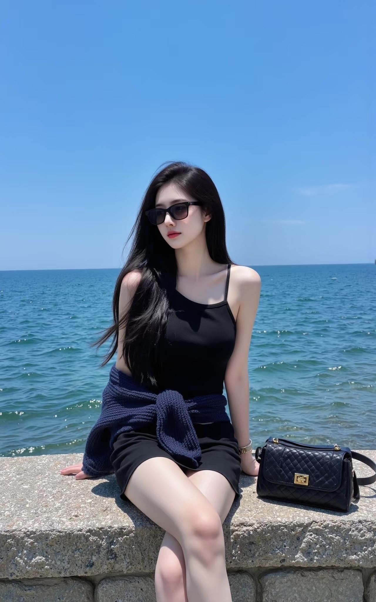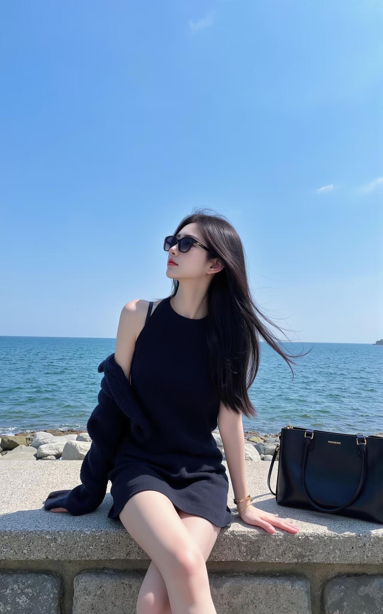 海边美女戴着墨镜,好酷!