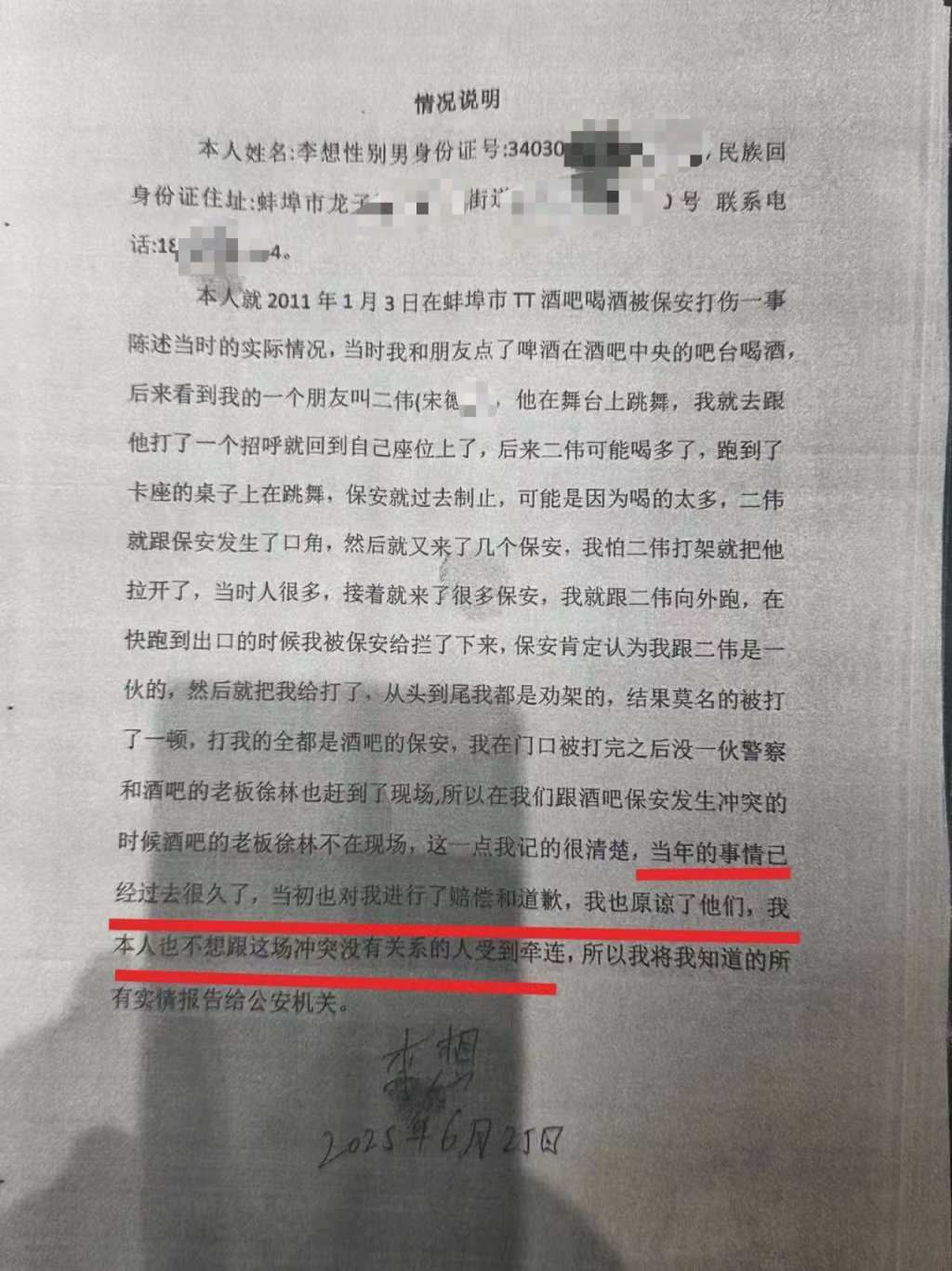 多名当事人家属表示不解,其中一名家属找到了当年该案件的受害人李想。李想表示,这些年他从未提起过控告。他还出具了一份有签名、手印的“情况说明”,称“当年的事情已经过去很久了,当初也对我进行了赔偿和道歉,我也原谅了他们。我本人也不想让跟这场冲突没有关系的人受到牵连”。