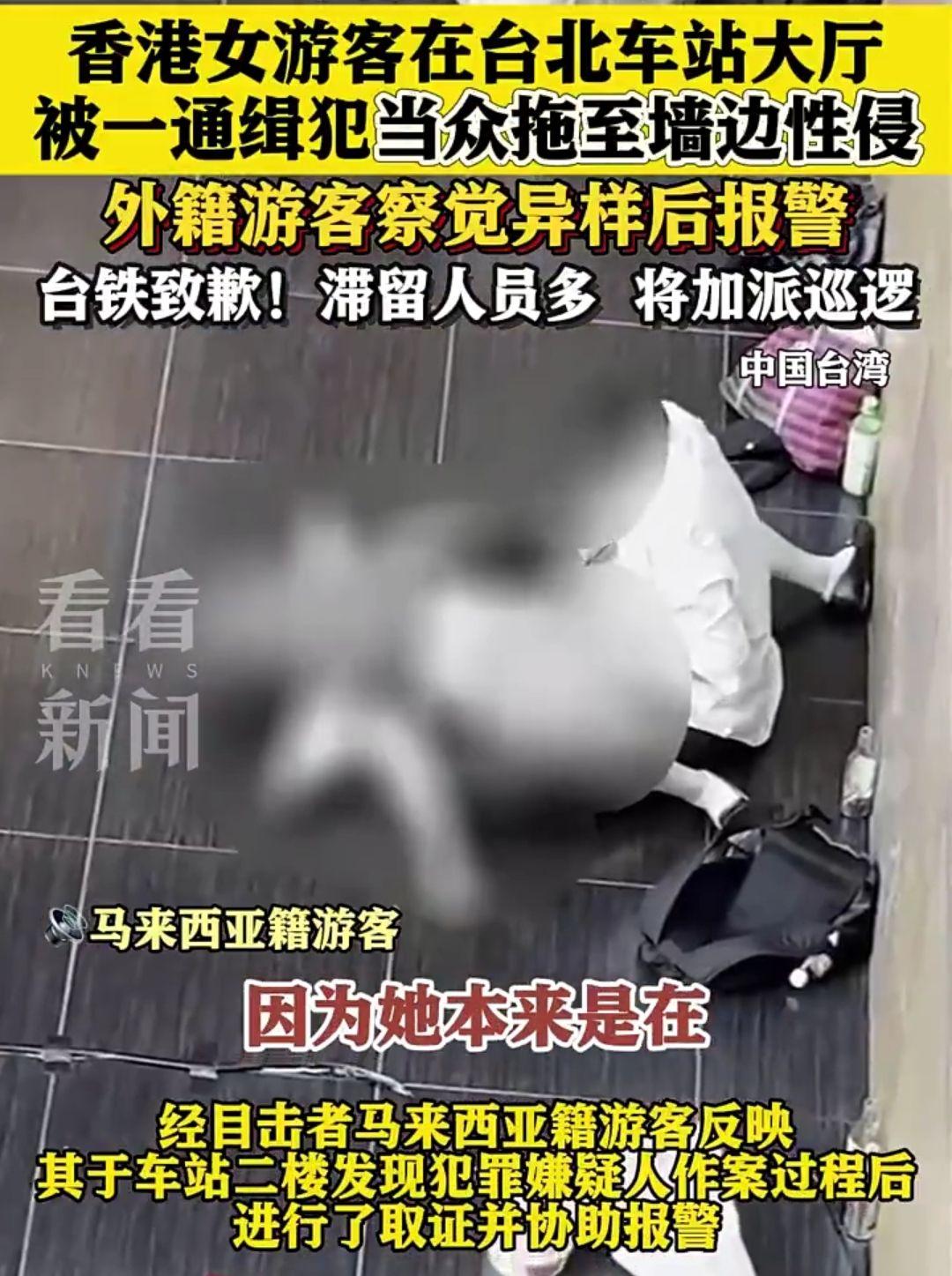 光天化日,女子在台北车站大厅惨遭侵犯;路人冷漠围观10分钟,竟无一人报警 近日,台媒爆料了一桩令人发指的案件。在大约一周前的10月9日下午,在台北车站大厅,一名香港女游客因醉酒而熟睡,竟被一名男子拖到了墙边,惨遭当众性侵。离谱的是,光天化日之下,车站人来人往,男子作案时间长达10分钟,竟没有一个人出手制止,也无一人报警,还是一名马来西亚游客偶然看到后才拍下视频,并拨打了报警电话。女子在台北车站大厅遭侵犯无人制止 事后,该马来西亚游客接受采访时震惊表示,没想到这里的治安如此糟糕,民众也冷漠到了这种地步,竟能放任如此恶劣的案件发生在自己眼前。 更让人震惊的是,作案男子竟是一名通缉犯,据称去年曾犯下类似案件被判刑,但不知为何没被收监,反而失踪了。案件被曝出后,台北警方第一时间也不提严惩凶手,反而呼吁外界“安心”,因为这名通缉犯和香港女游客是朋友关系,并非随机作案(不过岛内舆论普遍不信这种说辞)。 一些绿营网民则死命替民进党当局开脱。他们不同情受害者,反而指责香港女游客不该独自酒醉,“需要自己为被性侵受害一事负责任”,还有人将此事扯到“蓝绿对立”,声称这都是因为国民党治理台北市所致(然而台北车站是民进党当局直接管辖)。眼看岛内舆论很快偏题,无人关心可怜的受害者,有统派网友悲哀的表示,所谓“台湾最美的是人”就是一句笑话,看来,除了统一,真的没有什么能救得了台湾了。