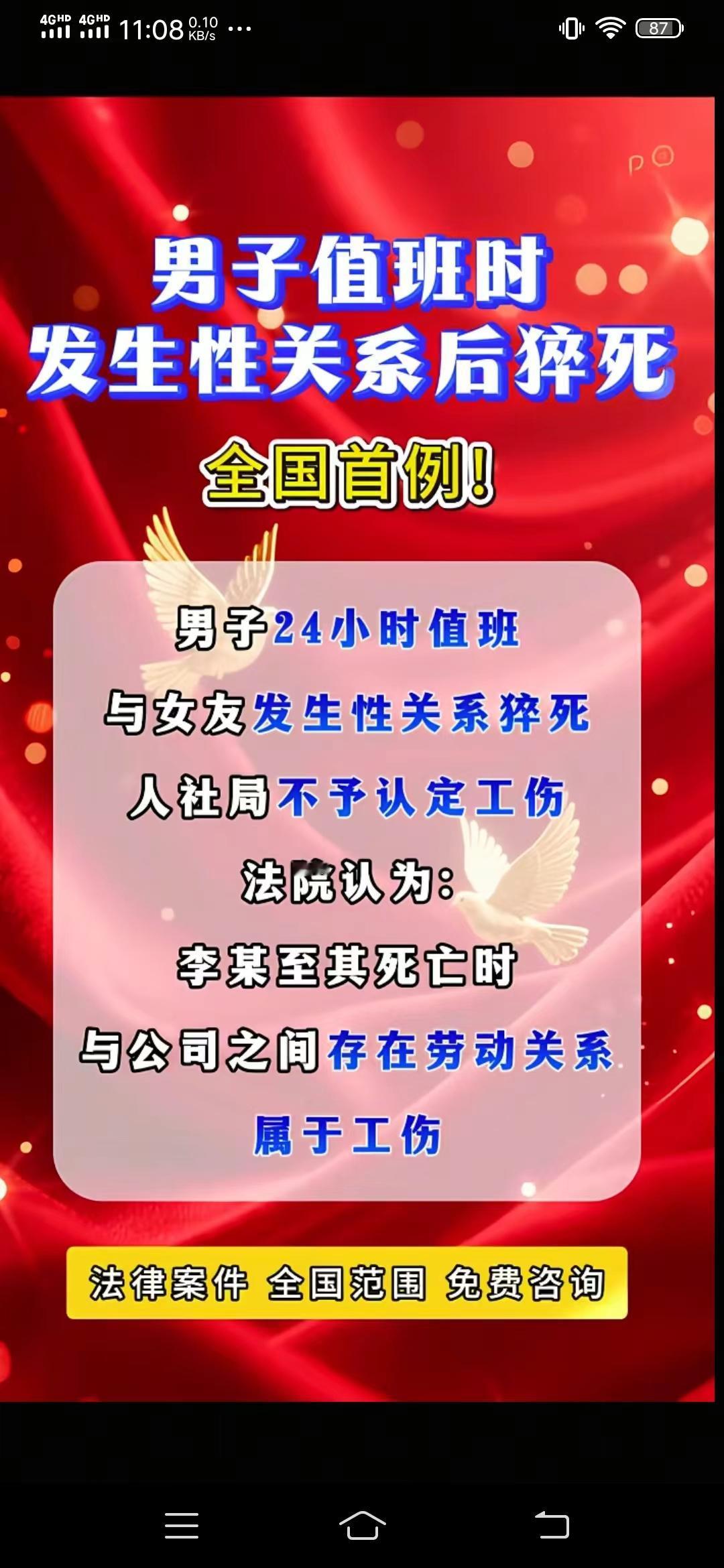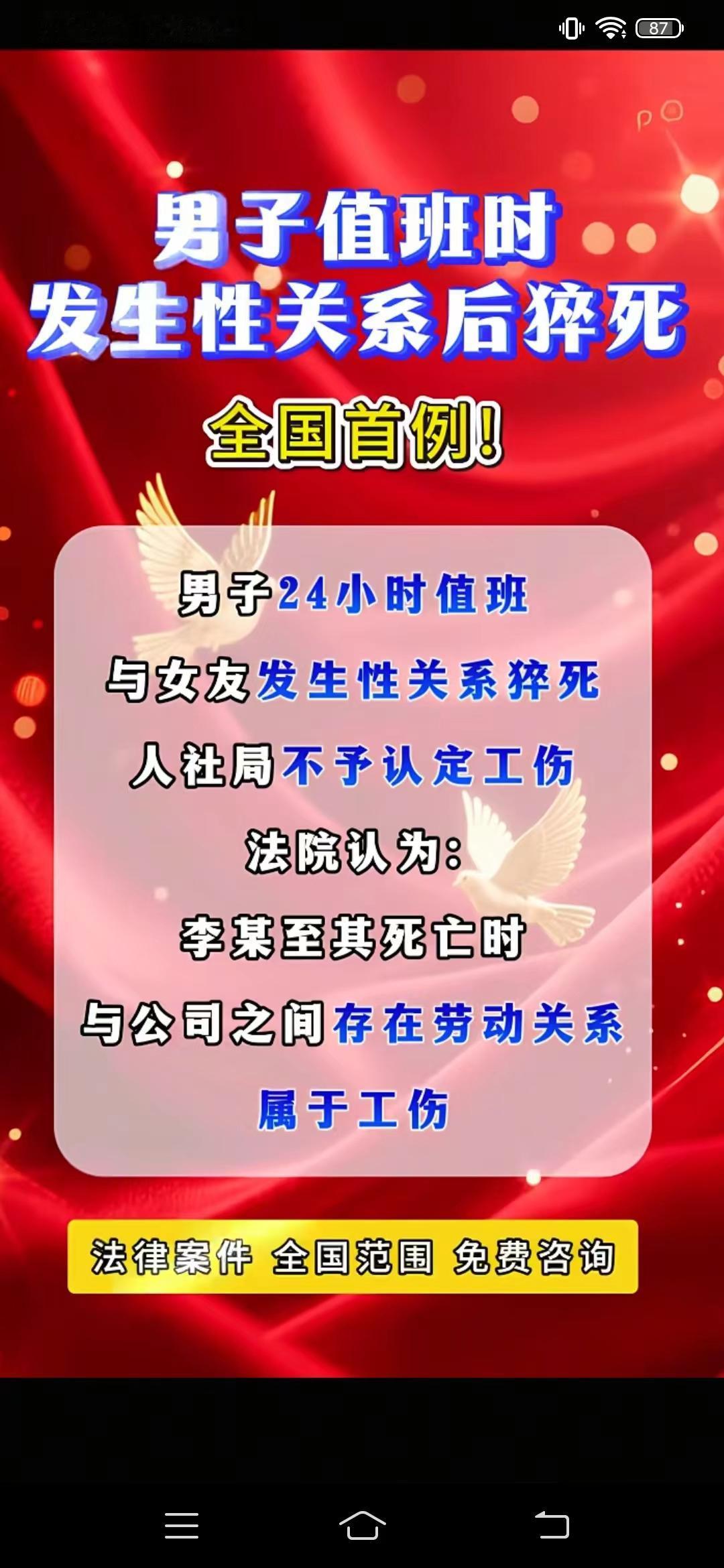 值班乱搞猝死还要别人买单在北京一处废弃工厂全日执班的保安张老三,因耐不住寂寞,便叫来女朋友陪伴,倆人在值班室发生性关系后,张老三突发疾病猝死。 人社局以张老三违反劳动法规定擅自将女朋友带进值班室,并发生性关系猝死,不属于工伤。 经法院审理认为:张老三在值班室猝死,是在其工作时间、工作地点内,应属于工伤。 我个人观点:张老三在工作时间,把女朋友带进值班室发生关系后猝死,这是张老三有错在先,值班室内怎么可以乱搞男女关系?搞男女关系死了,还要叫别人帮你买单,这个不合理!