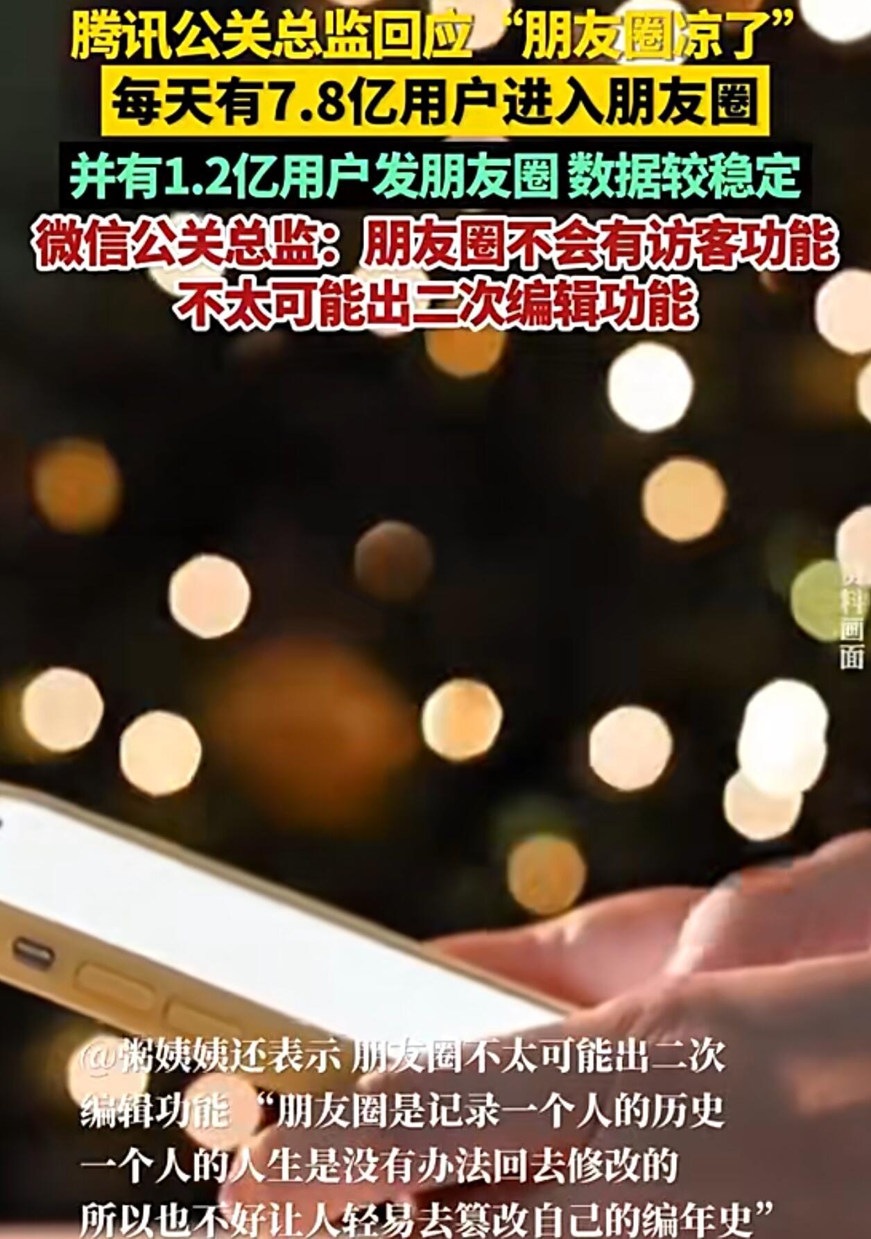 最近总听人说朋友圈“凉了”,搞得我也忍不住琢磨,好像确实没以前热闹了。身边朋友发得少,自己刷来刷去也就那几条,难免有种“大家都懒得发了”的感觉。 但前两天看到微信公关总监出来回应,说这其实是“信息茧房”在作怪——说白了,就是咱们每个人的圈子有限,看到身边几个人不发了,就以为整个朋友圈都冷清了。 结果人家甩出数据,我一看还真有点意外:每天有7.8亿人会点开朋友圈,1.2亿人还在坚持发动态。这哪是凉了?明明还热乎着啊! 想想也是,虽然好多人现在发得少了,但朋友圈的功能其实一直没变。有人在这记录一日三餐,有人分享旅行风景,也有人随手转发一篇好文章。不是没话说,只是表达方式变了。 我自己现在也属于“偶尔发一条”的类型,不像以前屁大点事都想晒。但每次发完,还是会有朋友点赞评论,那种互相惦记的感觉其实还在。 说到底,朋友圈没凉,只是我们长大了,或者更谨慎了。它不再是唯一的情绪出口,但依然是很多人生活中离不开的一块小天地。你还在发朋友圈吗?是每天必发还是偶尔冒泡?评论区聊聊呗~