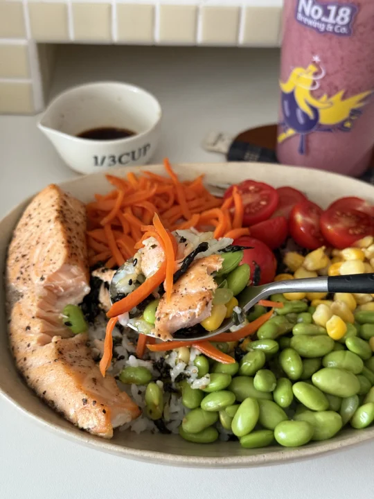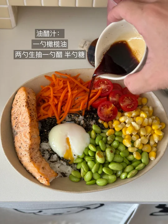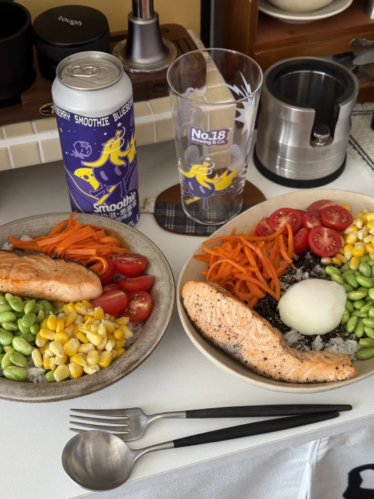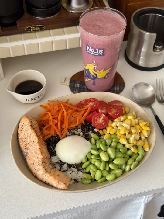 谁懂啊!打工人的快乐餐被我找到了✨ 自制三文鱼波奇饭 好吃到舔盘还低卡! 午餐这么安排,幸福感直接拉满~ - ▪️食材清单: 三文鱼🍣、米饭🍚、海苔碎🥢、温泉蛋🥚、胡萝卜丝🥕、小番茄🍅、毛豆🫘、玉米粒🌽 ▪️油醋汁: 1勺橄榄油+2勺生抽+1勺醋+半勺糖, 搅拌均匀就搞定~ - ▪️超简单步骤: ▫️三文鱼撒黑胡椒+盐腌制,少许油煎到表面金黄,内里嫩到飙汁! ▫️煎鱼的油别浪费!炒软胡萝卜丝超香;毛豆、玉米粒焯水,小番茄切半备用。 ▫️米饭铺底撒海苔碎,依次摆上所有食材,中间卧个温泉,淋上油醋汁拌匀——开炫! - 🍓【莓果思慕雪酸啤】配餐! 挖到宝了!这款莓奶滋·思慕雪好惊艳! 入口是绵密到像云朵的质地,蓝莓🫐+草莓🍓的酸甜果香超浓郁,还加了香蕉🍌平衡 喝着像果味奶昔却更丝滑,甜度刚刚好🥤 - 打工人干饭准则:既要健康又要开心! 这顿营养拉满还不难做,赶紧收藏起来试试~