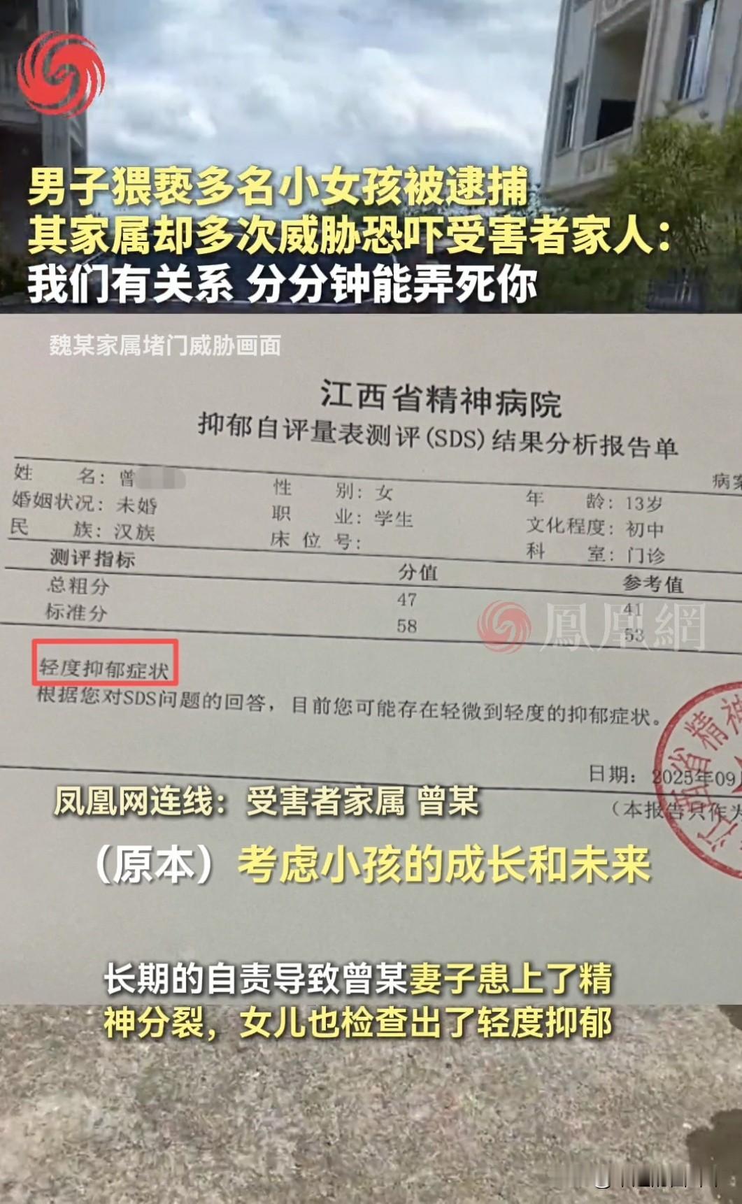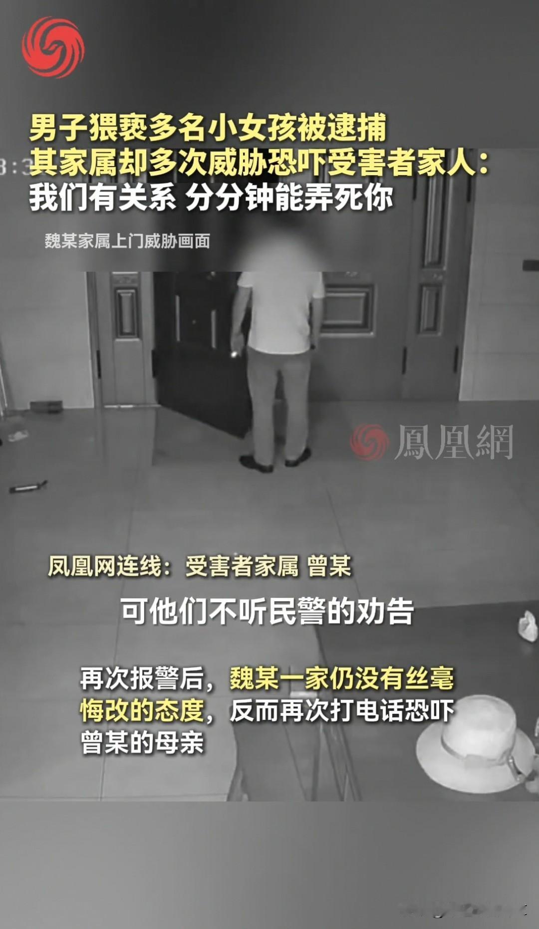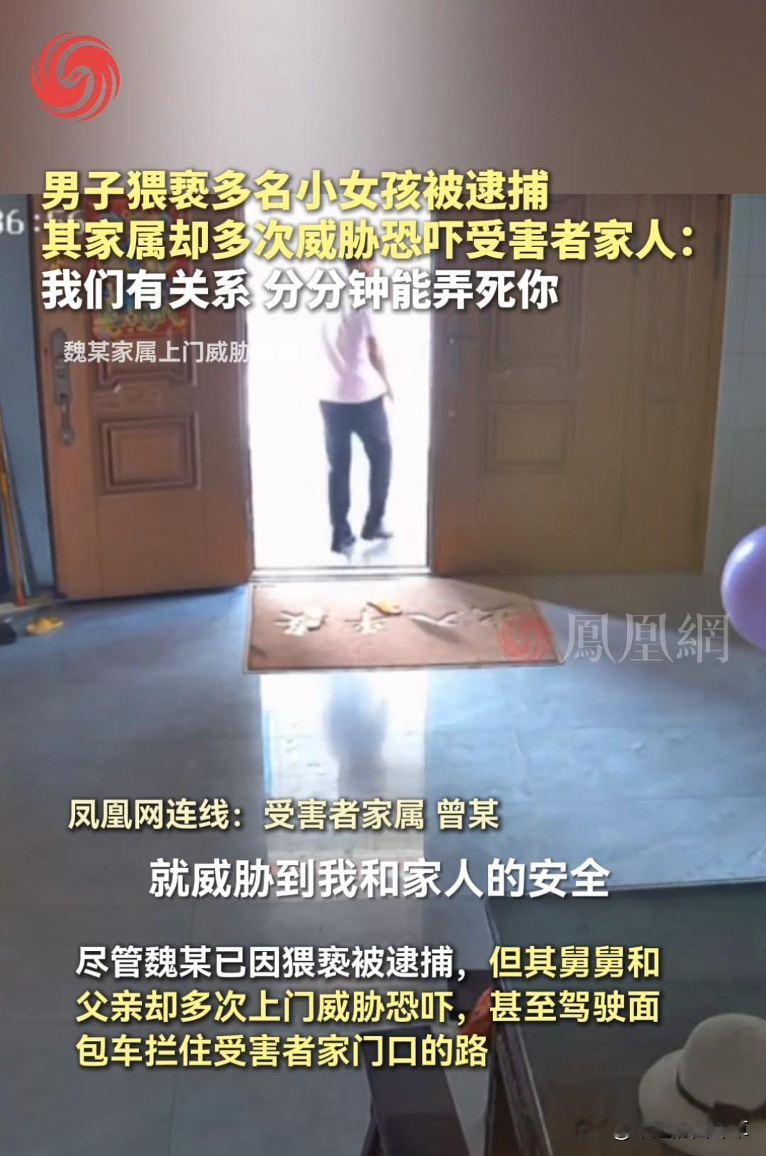 上门骚扰、恶意恐吓、包庇恶行!涉事家庭毫无悔意,受害家庭的公道何时能到? 近日,江西省丰城市的网友曾某向凤凰网反映,其13岁的女儿在2021~2023年间多次遭到37岁已婚男子魏某wei亵,且受害者不止她一人,据曾某描述,魏某长期用买零食作诱饵,诱骗多名幼女到车上实施反复wei亵,行为令人发指! 曾某起初为了孩子的成长和未来,选择沉默想求得安宁,可妻子过度自责因此患上精神分裂症。忍无可忍报警后,更过分的事来了——魏某的舅舅不仅不认错,还嚣张威胁:“魏某没违法,就算以前违法也过去了!我到处都有关系,你想死?分分钟弄死你!不听就威胁你和家人安全!” 更甚者,魏某的父亲直接开面包车堵在受害人家门口,民警多次劝告都不听,毫无悔改之意,还打电话恐吓受害者的母亲! 幼女的安全被践踏,受害者一家遭威胁骚扰,这样的恶行绝不能被沉默掩盖!希望更多人关注此事,帮受害者讨回公道! 新闻来源:鳳凰网