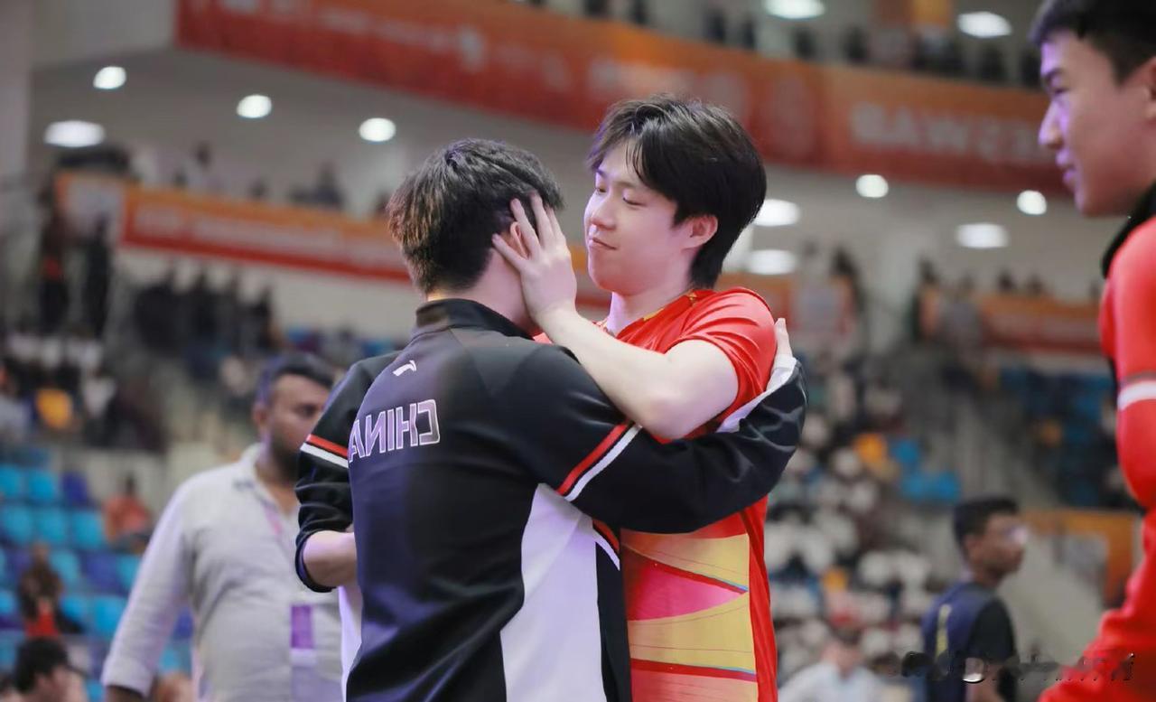王楚钦对小石头林诗栋也真的偏爱啊!大头现在真的是越来越有大哥哥的样子了!林诗栋跟王楚钦这俩人也太甜了吧,大头抱着委屈的林诗栋,又是抱又是搓的,笑得跟朵花一样!马龙和樊振东退出之后,王楚钦现在成了队内的顶梁柱,接过了马龙和樊振东传帮带的重担,那天晚上谢谢林诗栋把中国队从悬崖边上拉回来!通过半决赛跟日本队的那场恶战,也算是跟乒乓球队有过命的交情了,希望尽快成长为中国乒乓球男队的得力干将,少让王皓教练操点心!