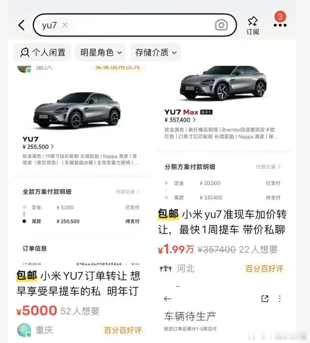 据此前报道,今年7月,小米 YU7 订单在二手市场还是“香饽饽”,当时部分订单最高能溢价 2 万元转手。