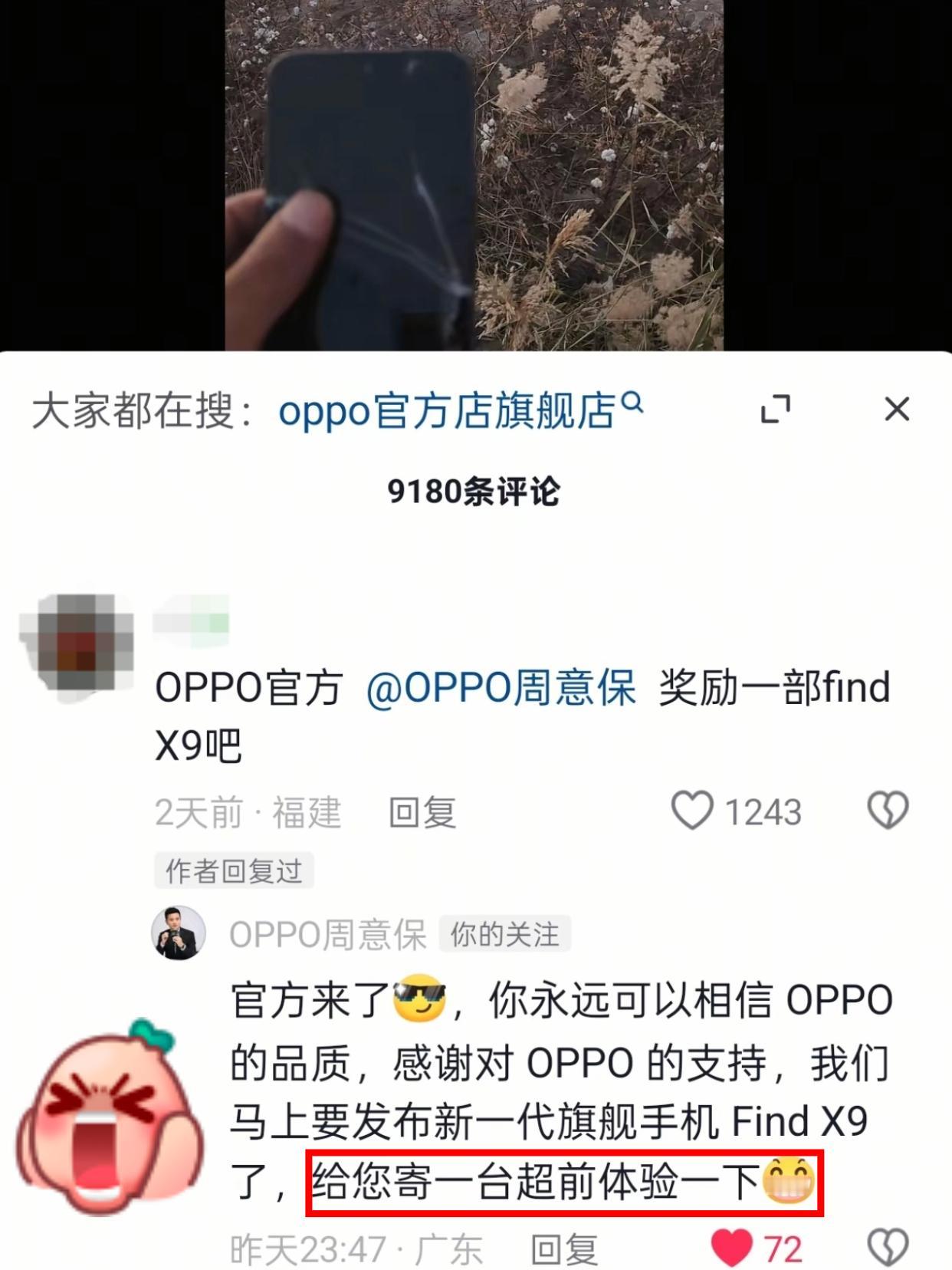 不是,OPPO现在都是直接送手机的吗。。。 OPPO周意保这格局打开了啊,晚上OPPO Find X9系列就要发布了,这位网友直接免费拿一台超前体验了,什么时候这种事才能轮到我!! 这网友运气不咋好,但是又好像有点太好了!!!手机被拖拉机压坏了还能打电话,随手发个视频,没想到被保哥刷到了,直接给换新了,X9我也想超前体验啊,羡慕了。。。 OPPO OPPOFindX9 OPPOFindX9Pro