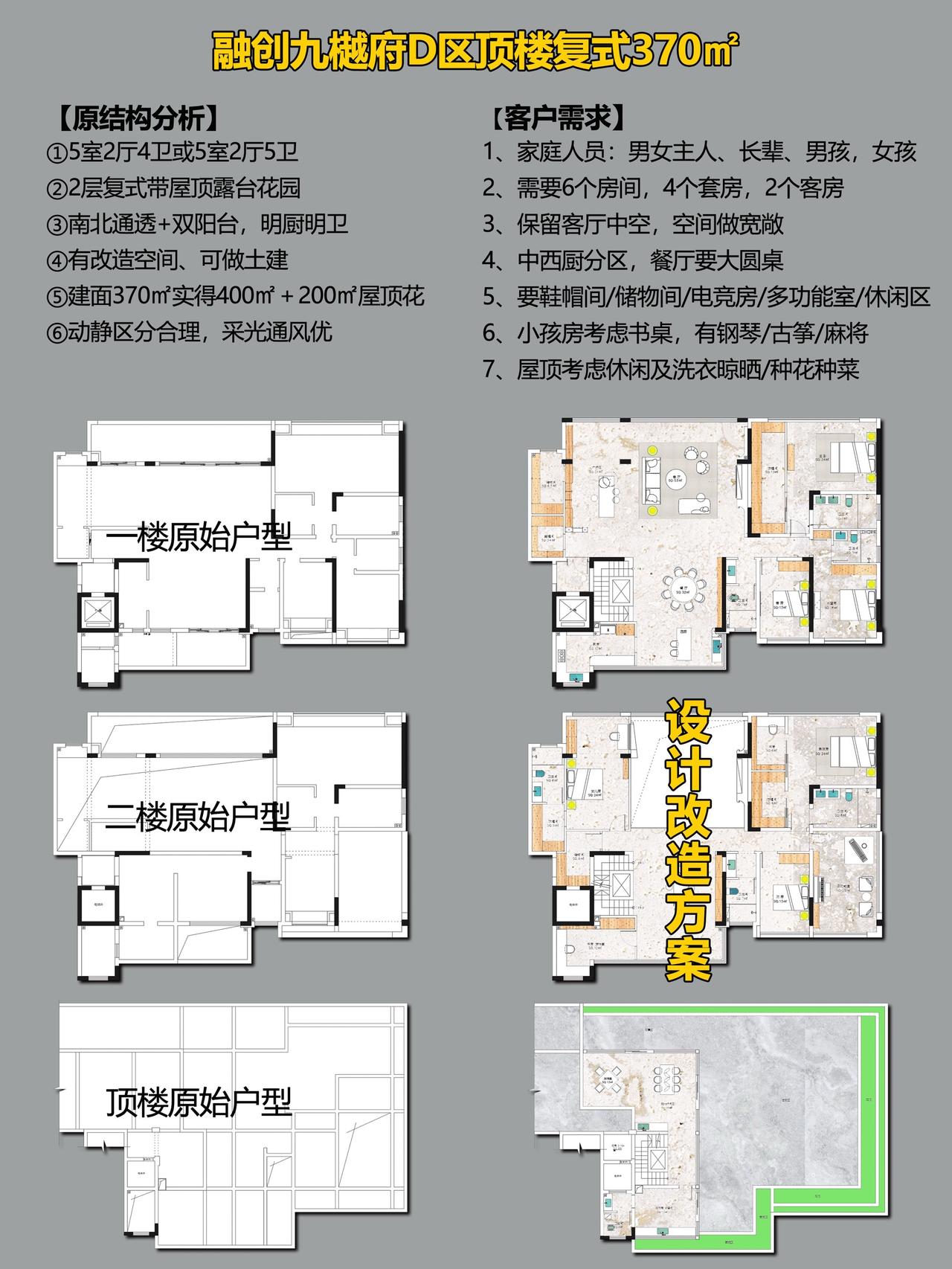 融创九樾府D区370㎡顶楼复式装修设计!我家风格我命名❗️我的家,不法式也不日系,我家的风格很我!Hello!今天给大家分享近期的一个案子,粉丝客户的新家,融创九樾府大平层顶楼复式意式轻奢风!🍀 项目信息📋 📍楼盘:融创九樾府 🏠户型:大平层顶楼复式(洋房) 📏面积:370㎡,实得600㎡ 🎨风格:意式轻奢风格 🏠 【原结构分析】 ①5室2厅4卫或5室2厅5卫 ②2层复式带屋顶露台花园 ③南北通透+双阳台,明厨明卫 ④有改造空间、可做土建 ⑤建面370m 实得400m +200m屋顶花 ⑥动静区分合理,采光通风优 📝 【客户需求】 1、家庭人员:男女主人、长辈、男孩,女孩 2、需要6个房间,4个套房,2个客房 3、保留客厅中空,空间做宽敞 4、中西厨分区,餐厅要大圆桌 5、要鞋帽间/储物间/电竞房/多功能室/休闲区 6、小孩房考虑书桌,有钢琴/古筝/麻将 7、屋顶考虑休闲及洗衣晾晒/种花种菜 📝 【设计思路】 本案例客户是三代同堂之家,做为大平层已经很好用了,作为顶楼复式来说真是大宅雅居,上下分为三层结构,一楼以会客及餐厨、主卧、老人房、客房为一体;二楼以小孩房及休闲娱乐为一体;三楼做为屋顶花园,以洗衣晾晒、休闲娱乐以及种花种菜为一体。 ✅每一个空间的利用都恰到好处,如果你在贵阳恰好有大平层/复式/别墅需要装修设计,欢迎见面沟通交流❗️❗️ 👉【关于我】 一位充满热情、细心、靠谱的90后设计师。拥有别墅、洋房、跃层、大平层、普通住宅10年设计经验。如果你正为装修设计发愁,希望我的设计与创意能为你排忧解难! ✅擅长风格 意式、新中式、现代简约、奶油风、宋式美学、中古风、法式风、现代轻奢等… 📄【以往案例】 中铁阅花溪|中铁逸都|中铁阅山湖|阅山湖云著|华润悦府|中海映山湖|茅台广场|美的林城|金融城|融创九樾府|中海印龙泉|华润九悦|龙湖天曜|龙湖湖山原著|万科鸣翠|万科麓山|铁建城|龙湖舜山府|远大美域|观山小区|建发和玺|保利公园 。。。。。。 贵阳装修 融创九樾府 顶楼复式 全案设计