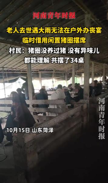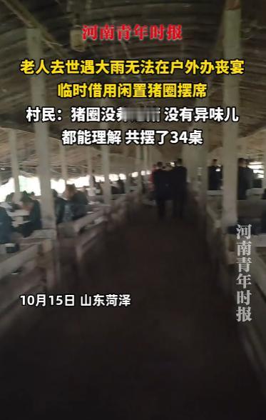 “离了个大谱!”10月15日,山东菏泽,一老人去世遇大雨,无法在户外办丧宴,家人临时借用闲置猪圈摆席,一个圈摆一张桌子刚刚好,亲朋好友表示可以理解,网友:这都是雅间啊! 在农村,老人去世一般都会在院子里摆上几天流水席,接待前来吊唁的亲朋好友,可如果临时遇上雨天来不及支雨棚,可就麻烦了。 一老人去世遇上下大雨,老人的家人来不及支雨棚,无奈之下,他们只好临时借用了一个闲置猪圈用来摆流水席。 这个猪圈建成后还没有养过猪,里面没有异味也很干净,猪圈中间的过道方便上菜,一个圈放一张圆桌刚刚好,客人们也能坐得下,还能看到外面的风景。 坐在这里吃饭和在饭店里的包间没什么太大的区别,甚至还别有一番风味,打扫卫生也比较方便,最主要的还是淋不着雨,比在户外支雨棚还舒服些。 这顿大席摆了34桌,亲朋好友们对于老人的家人在猪圈摆席也都能理解,毕竟短时间内去准备雨也来不及,可能还会耽误了开席的时间。 不少网友认为这就是雅间,虽说是猪圈,但该有的也都有,甚至有人还表示如果不说是猪圈,他还以为是海边的特色餐厅! 信息来源:《老人去世遇大雨无法在户外办丧宴,临时借用闲置猪圈摆席》河南广播电视台