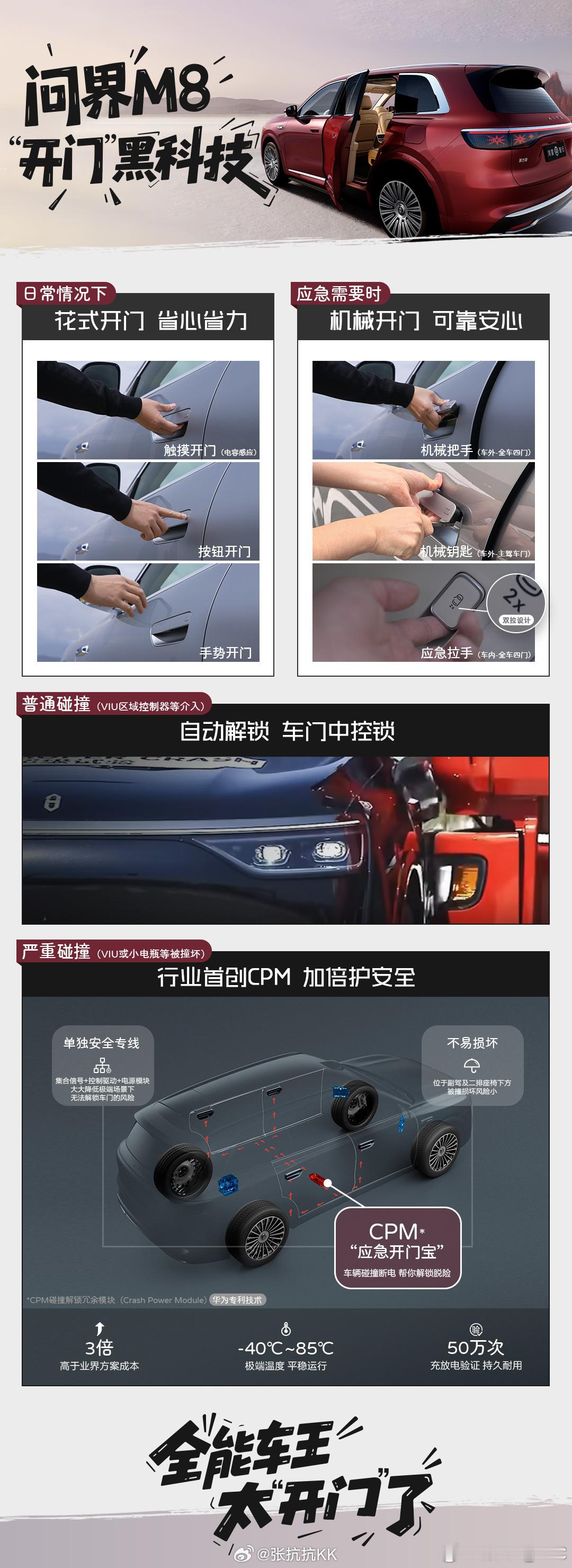 给门锁系统持续供电,尽量让全隐藏式门把手在极限情况下能弹出来,比如华为的CPM。