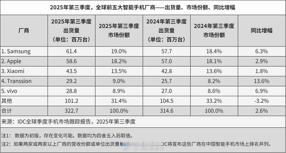 全球市场三星、苹果和小米依然是稳定的前三强,传音和vivo都有不错的涨幅。