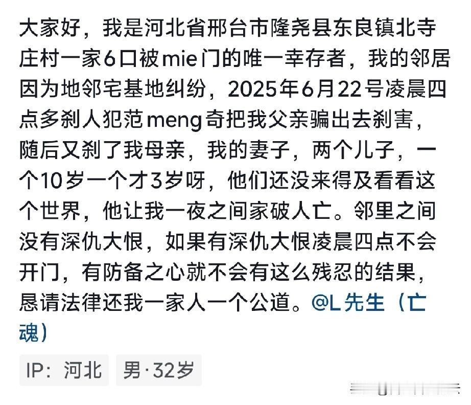 这是全网最让人心疼的一个男人了。 他的父母、妻子、两个儿子都被邻居给杀害了,一个念想也不给他留啊! 邻居灭门的原因,不是什么深仇大恨,就是和他家宅基地有纠纷。我虽然知道很多农村人把宅基地看的很重要,但是为了这个杀人也太不可取了吧! 有矛盾你可以找村委,找政府。实在不行,你去法院起诉,还不行吗?为什么要这么极端呢? 男子说邻居是在凌晨四点先把他父亲骗出去杀害,然后又回来杀害的他母亲和妻儿。 我觉得,邻居既然能在这么早叫的动他的父亲,说明在他父亲眼里,两家关系还不错。不然他父亲也不愿出去。这就说明这个邻居很极端了,人家没把这件事放在心里,你却耿耿于怀了,这个人心胸太狭隘了。 男子的两个儿子,一个10岁,一个才3岁,邻居一个也没放过。太狠了! 对于这件事,你怎么看呢?
