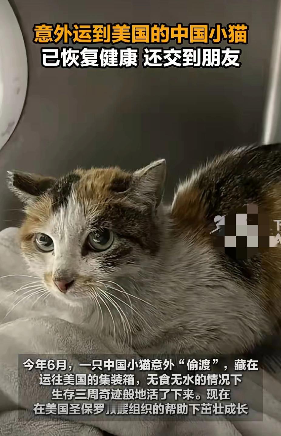 中国小猫"偷渡"美国21天不死!靠喝冷凝水续命,网友:这猫比我还强 谁能想到?一只中国小猫没办签证没买机票,硬生生靠"藏箱绝技"完成了跨太平洋旅行,还成了中美网友都心疼的网红! 这小家伙不知咋钻进了发往美国的集装箱,一待就是三周,全程没吃没喝。等美国工人发现它时,瘦得只剩一把骨头,脱水脱到快睁不开眼,却硬是没断气——后来大家猜,它八成是靠啃箱子里的小老鼠、舔壁上的冷凝水活下来的,简直是猫界"生存大师"! 现在小猫已经在寄养家庭养得白白胖胖,之前怯生生躲角落的样子全没了,每天追着逗猫棒跑,美国救助站还在给它征名,LeMao、Moxie这些名字都快把评论区刷爆了。不得不说,这生命力也太顽强了,果然"中华小猫咪"名不虚传! 咱养宠人最懂这种揪心又感动的滋味,毛孩子就算遇到天大的坎都能扛过去,这股劲儿真该学一学。而且不管是中国还是美国的救助者,都在为这小生命忙活,这不就是最暖的"跨国爱宠接力"嘛! 你们说这猫该叫啥名字最贴切?叫"太平洋"还是"偷渡侠"?家里毛孩子有过啥让人惊叹的求生瞬间?评论区聊聊,看看谁家主子更有"小强体质"!它经济太香了 宠物界的生存奇迹