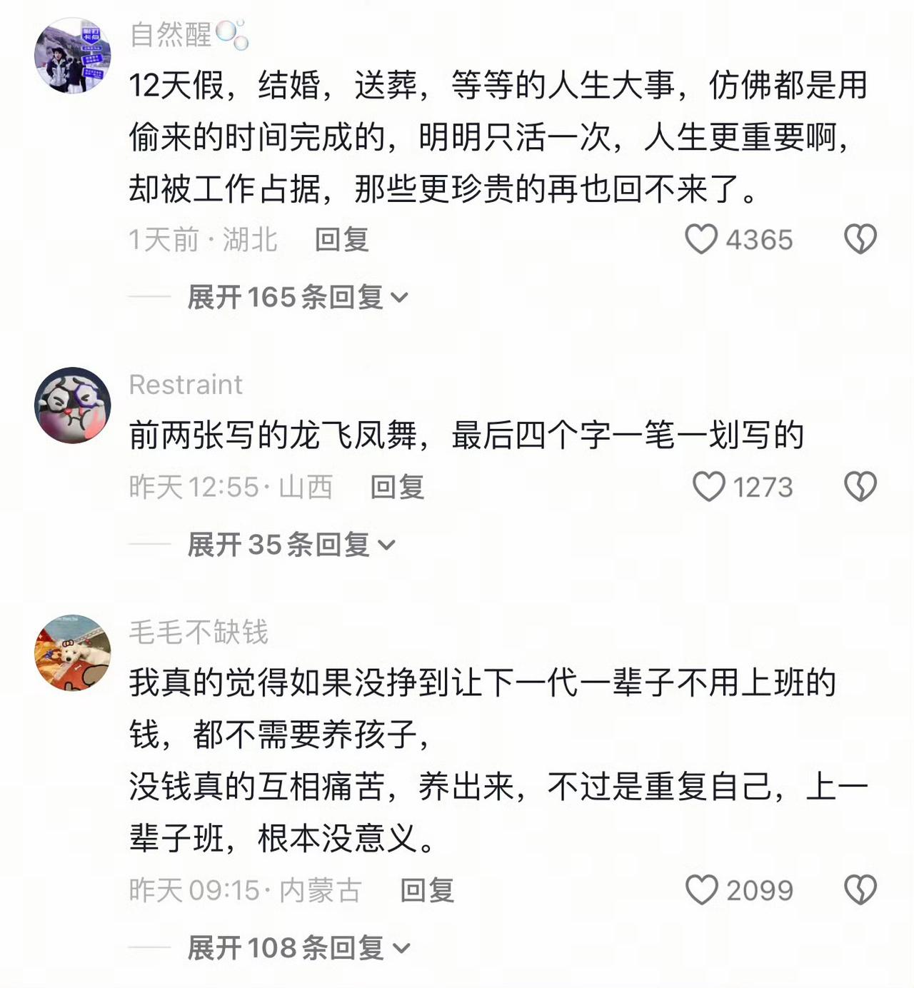 妻子病重,请假4天 妻子病重,请假5天 妻子离世,请假3天 一生的爱人、12天的假期,中国人一辈子的大事都要从上班中扣出几天时间来……