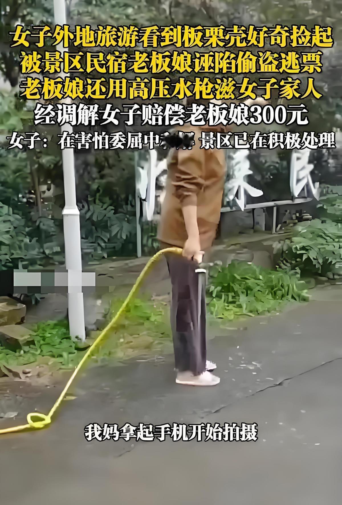 “白嫖上瘾了?”10月5日报道,江苏连云港,一女子和家人在景区游玩时,捡起地上带壳的板栗查看,不料,民宿老板娘立即冲出来吼他们,说他们是逃票的小偷,还吐口水、用高压水枪对着脸滋!经过警方的调解,女子赔偿了老板娘300元。网友:倒打一耙 信源:法治进行时 咱今天就来唠唠这个在国庆黄金周冲上热搜的“板栗冤案”。你说这事儿闹的,本来开开心心一家子去花果山游玩,谁能想到,就因为在路边多看了一眼板栗,愣是演了一出“人在囧途”的现实版。 10月5号这天,咱们这位女游客正和家人悠闲地走在花果山景区的山路上。突然,她眼睛一亮,被地上这个毛刺刺的小球球所吸引? 活了二三十年,她还是头一回见到带壳的板栗。这城市里长大的孩子也真是不容易,见个带壳的板栗都能兴奋半天。 她纯粹是出于好奇,随手捡起一个早就裂开、里头空空如也的板栗壳。你猜怎么着?就这么一个再正常不过的动作,愣是捅了马蜂窝! 只见旁边民宿里“嗖”地窜出来一位大姐,那架势,活像是抓到了什么江洋大盗。这位老板娘一上来就气势汹汹,一口咬定游客在“偷板栗”,更离谱的是,还非说人家是逃票进来的。 我的天,要真是逃票,谁还敢这么明目张胆在路边溜达啊?这逻辑也是没谁了。 咱们的女游客赶紧解释,说就是个空壳子,看看就扔。可老板娘压根不听,那架势,活像抓到了什么了不得的把柄。接下来发生的事,简直能刷新你的三观——这位大姐居然抄起洗车用的高压水枪,直接对着游客的脸就喷! 眼看着自己闺女受这委屈,当妈的能不急吗?游客的妈妈赶紧上前,推了下老板娘的手臂。好家伙,这一推可不得了,老板娘立马往地上一坐,说自己怀了两个月的孩子,这下可能要流产了。 这事儿到这里就变得特别微妙了。 你说她要是真怀孕了,还这么生龙活虎地拿着高压水枪跟人干架?反正我是不太理解这个逻辑。最后在警察调解下,游客一家赔了300块钱了事。要我说,这钱赔得是真憋屈,明明是自己先被欺负,最后反倒成了理亏的一方。 最讽刺的是什么?你们猜怎么着?就在国庆节前,连云港文旅局的官微还专门发文,热情洋溢地邀请大家来花果山“捡板栗”,说什么这是感受“大自然馈赠”的美好体验。 好嘛,官方让你来捡板栗,结果你真捡了,倒成“小偷”了?这操作,简直让人哭笑不得。 当这件事情发酵到网络上后,网友也做出了评论: “看着这是小事,实际是大事。能看出来这里的人文人品。按人品来说有游客来这里玩是客人到了,应该感到很荣幸,不要说游客捡到一个板栗主动给他一个两个板栗又有何方。这纯粹体现这里的人品问题,怎么还会辱骂客人,拿喷枪喷水客人脸,还倒地敲诈勒索客人。最终闹到调解,可是这个调解也能看出这里的人品,还要让客人赔偿300元。这客人是违法了吗?如果是客人违法为什么不直接让警察处理拘留或者判刑客人?分明是这里的人整体素质有问题,文旅局管理出现很大的漏洞。这样发展下去一定会给这个社会带来极坏负面影响。希望政府部门出面给这个社会把把脉 指导一下方向,让这个社会向更好的文明发展下去。” 对此大家有什么想说的,欢迎在评论区留言!