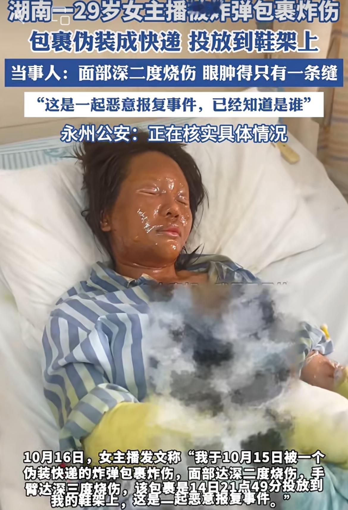 湖南永州一网络主播被伪装的快递炸弹毁容,身体多处深度烧伤,真相浮出水面。这名女孩