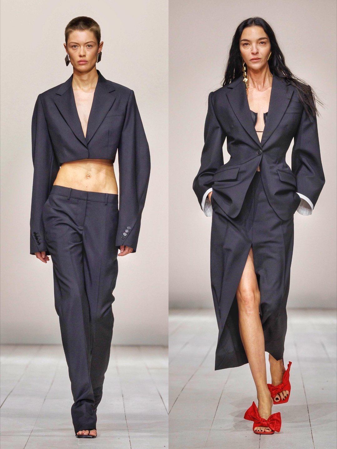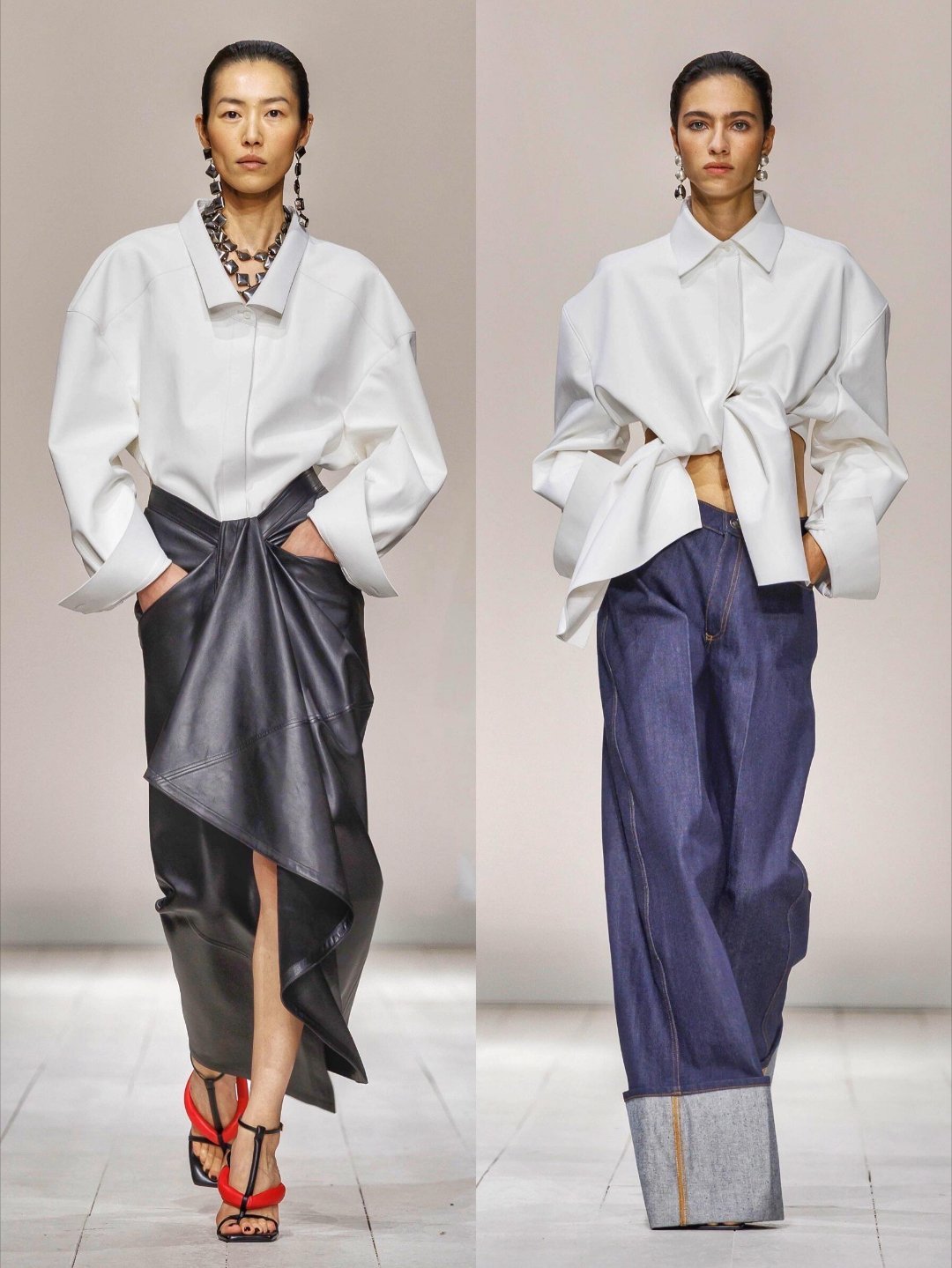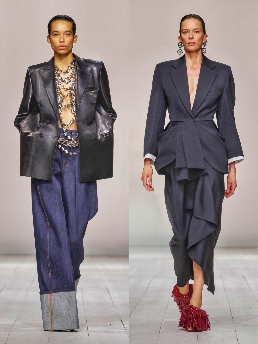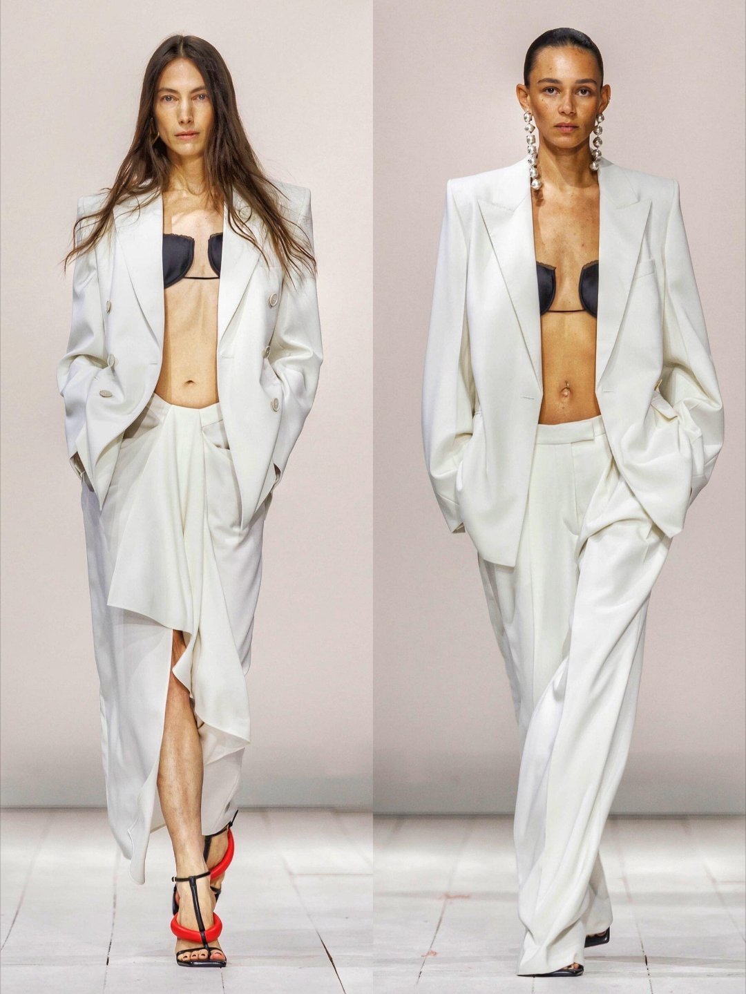 Burton始终将“确立Givenchy清晰的轮廓、女性形象和剪裁风格”视为核心任务,2026春夏系列无疑是对这一使命的深化实践。相较于首秀夸张的剪裁体积,本季最鲜明的突破在于“轻盈感”的塑造——通过移除外套内部的帆布衬垫,原本挺括的廓形变得如开衫般柔软随身,在保留结构感的同时,更贴合春夏季节的穿着需求,也让品牌标志性的剪裁语言更具实穿性。