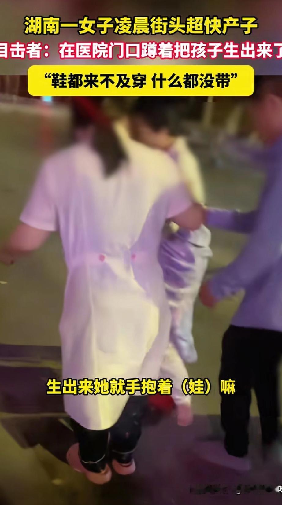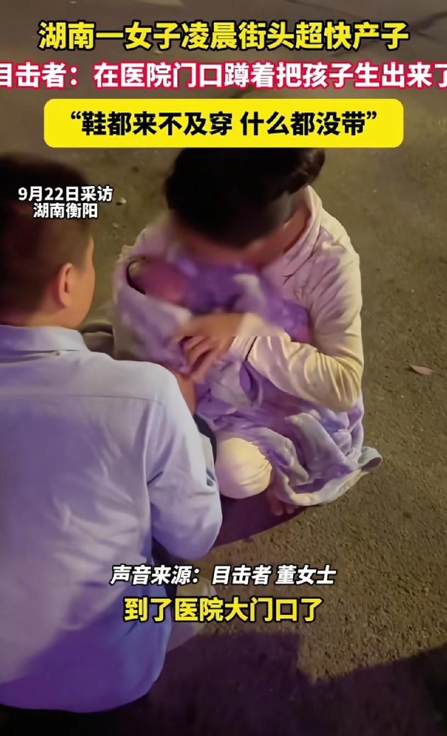 伟大的妈妈!湖南衡阳,一产妇不舍得花钱提前住院,感觉孩子差不多要出生,她才往医院赶,结果刚到医院门口,还没等办理住院就在路边把孩子生下来了!网友:为什么有的人生孩子那么容易! 据目击者透露,事情是发生在9月22日凌晨的,女子生下的是一名男婴,由于事发突然,当时身上是没有衣物遮挡的。 而女子的情况也搞不到哪里去,她是一着急连鞋子都顾不上穿,就在老公和姐姐的陪伴下赶往医院。孩子出生后,她是痛到动都动不了,脐带都没剪就这样抱着孩子蹲在路上,生怕会冻着孩子。 事后,女子老公和姐姐分头行动,一人去叫医生,另一人去买了一床被子过来给她们母子取暖。 此事在网上曝光后,引起不少网友的围观与热议! 有的网友认为,她这不是伟大,而是艰难,正常人谁愿意这样生孩子,穷人的伟大那不叫伟大,是没得选。 也有的网友表示羡慕,孩子顺顺利利出生,这位妈妈是幸运的,有的人痛上好几天都生不出来,她就这么一蹲,孩子就顺产了。 但有一说一,能让一名孕妇光着脚在路边生孩子的,身为丈夫及其家人是不负责任的,一瞬间,“伟大”这个词成为一张遮羞布,光着脚在外产子,将会是这个妈妈一辈子的阴影。 对于这件事,要是你有不一样的看法,评论区已备好沙发,快落座一起聊聊你的想法吧~