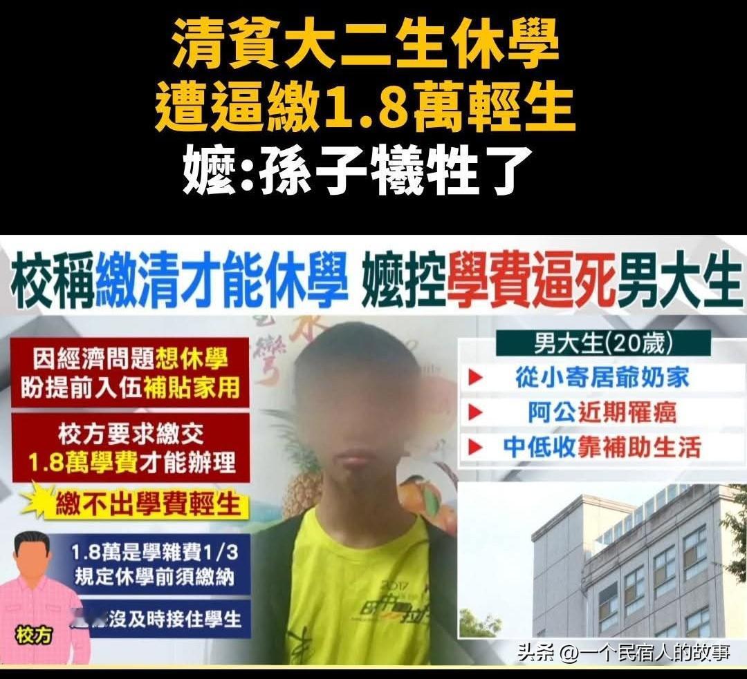 台湾大学生因交不起4千学杂费自杀!台吹快来! 今天岛内一则社会新闻引发热议,一名来自台中的贫困大学生因交不起1.8万(人民币4200左右)的学杂费自杀身亡。原来该大学生因为家庭贫困想休学去当兵补贴家用,但学校却要求该大学生缴清1.8万的学杂费,否则不给办理休学,但该大学生无力缴清1.8万台币的学杂费,随后自杀身亡。 该大学生奶奶哭诉是学校用学费逼死了她的孙子。 随着台湾少子化加剧,原来陈水扁时期大量兴建的大学因没有大学生逐渐关停,剩下没有关停的除了少数公立名牌大学,其余大多数大学都陷入生源减少的困境,对这些以收学生费用维生的学校来说,压榨学生就是唯一活下去的方式了,因此苛刻大学生费用成为常事。