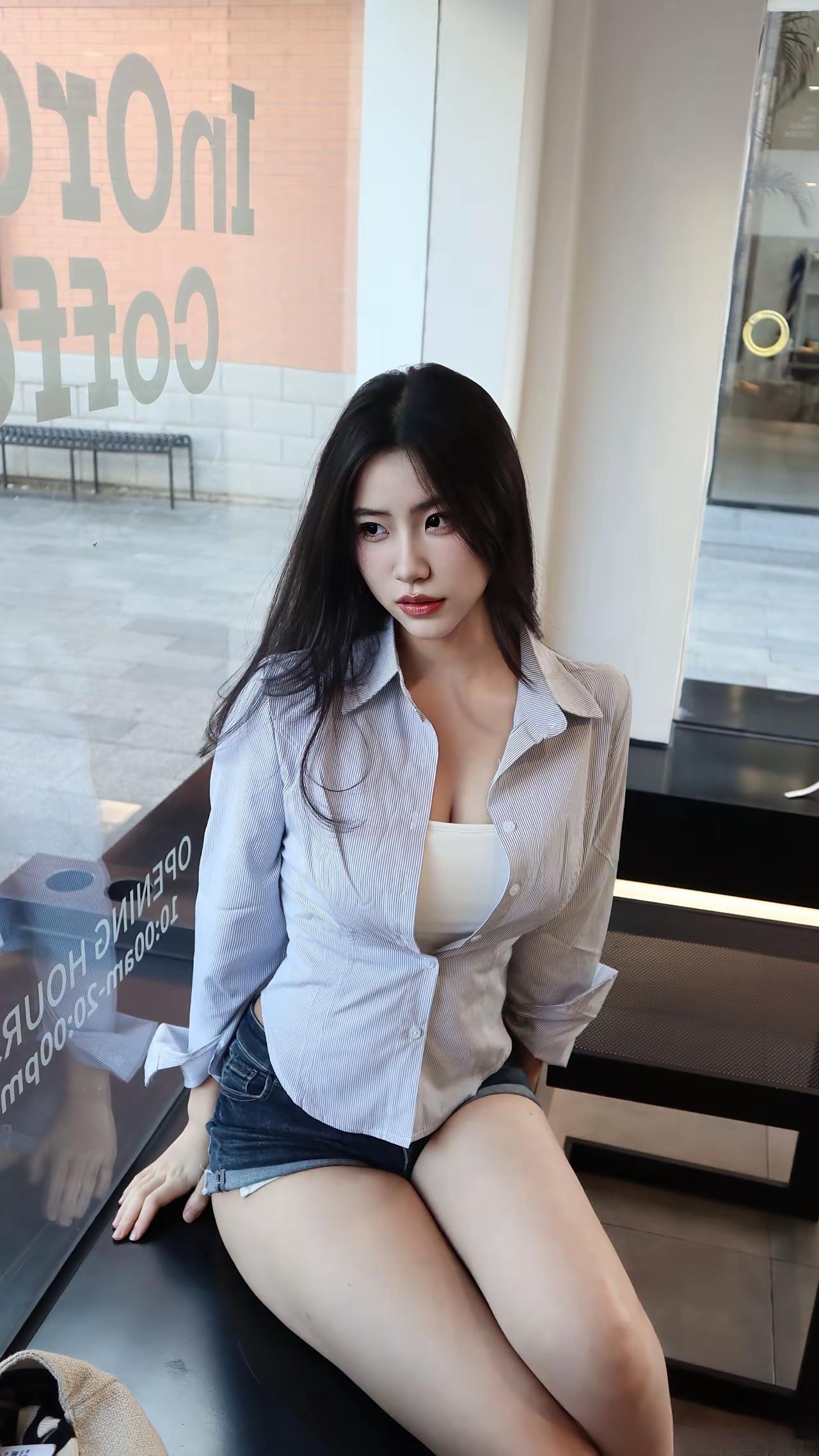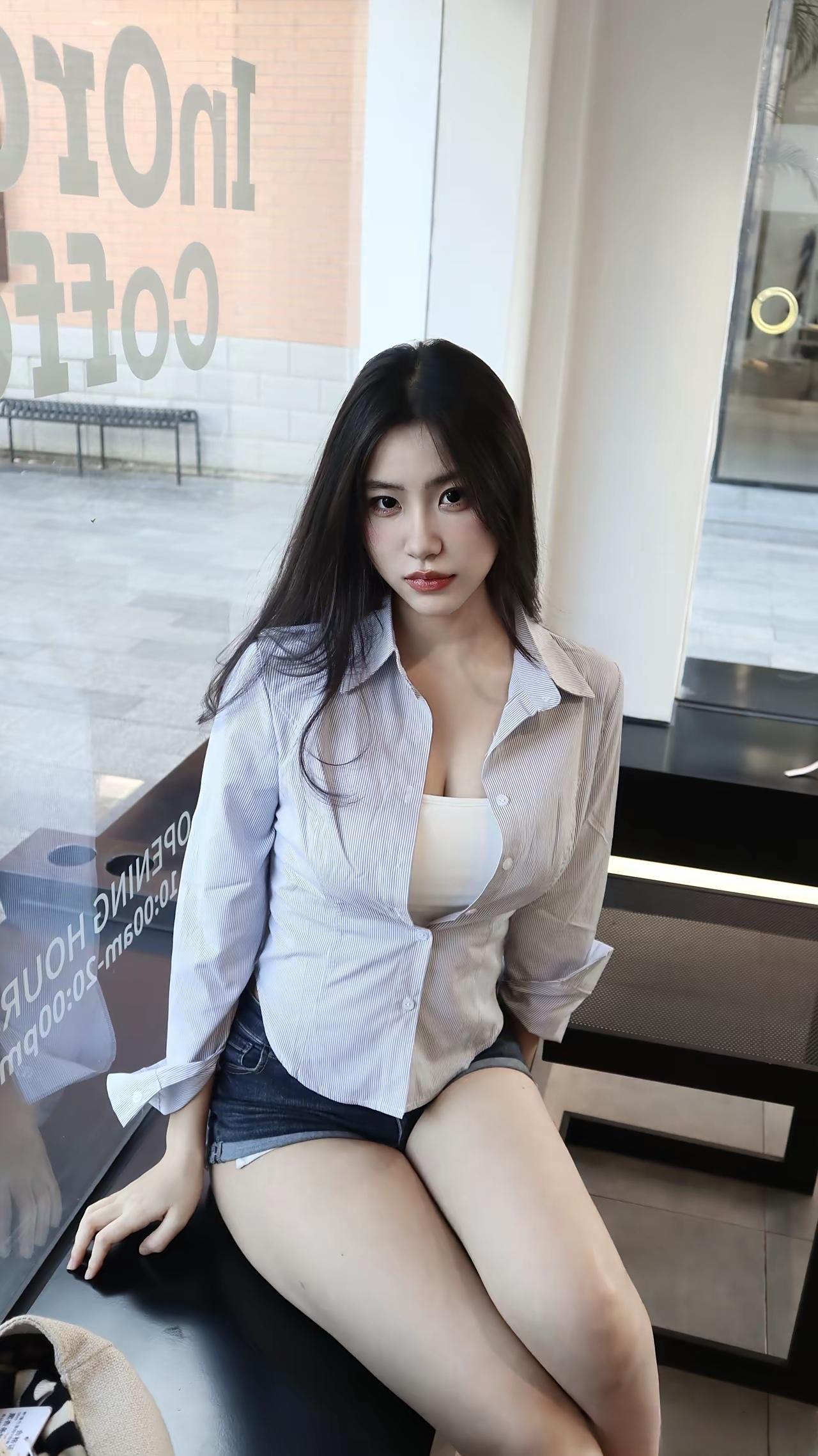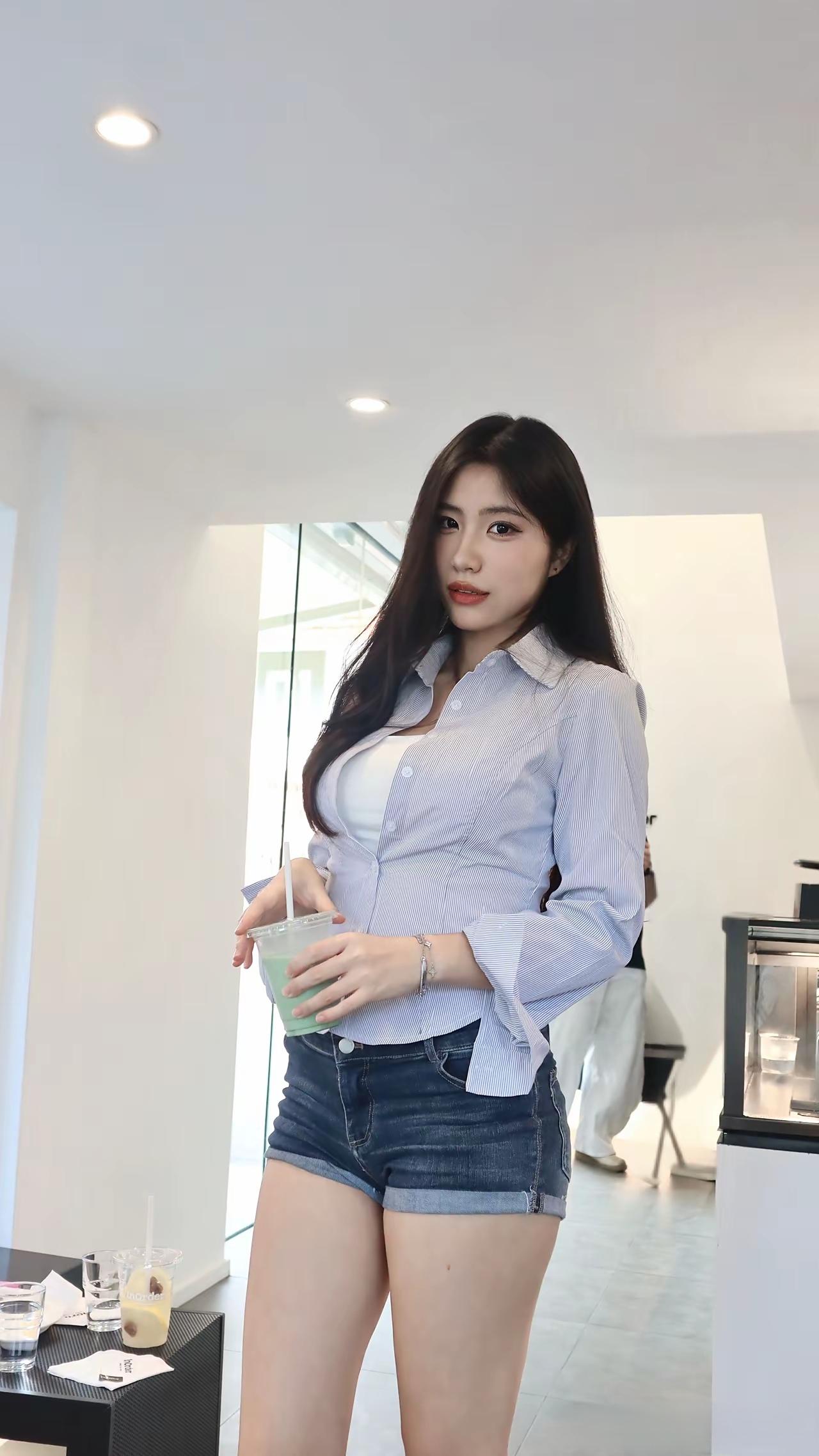 浅蓝色条纹衬衫搭配牛仔短裤,随性且不失精致感。手捧抹茶饮品,于光影交错之中,将咖