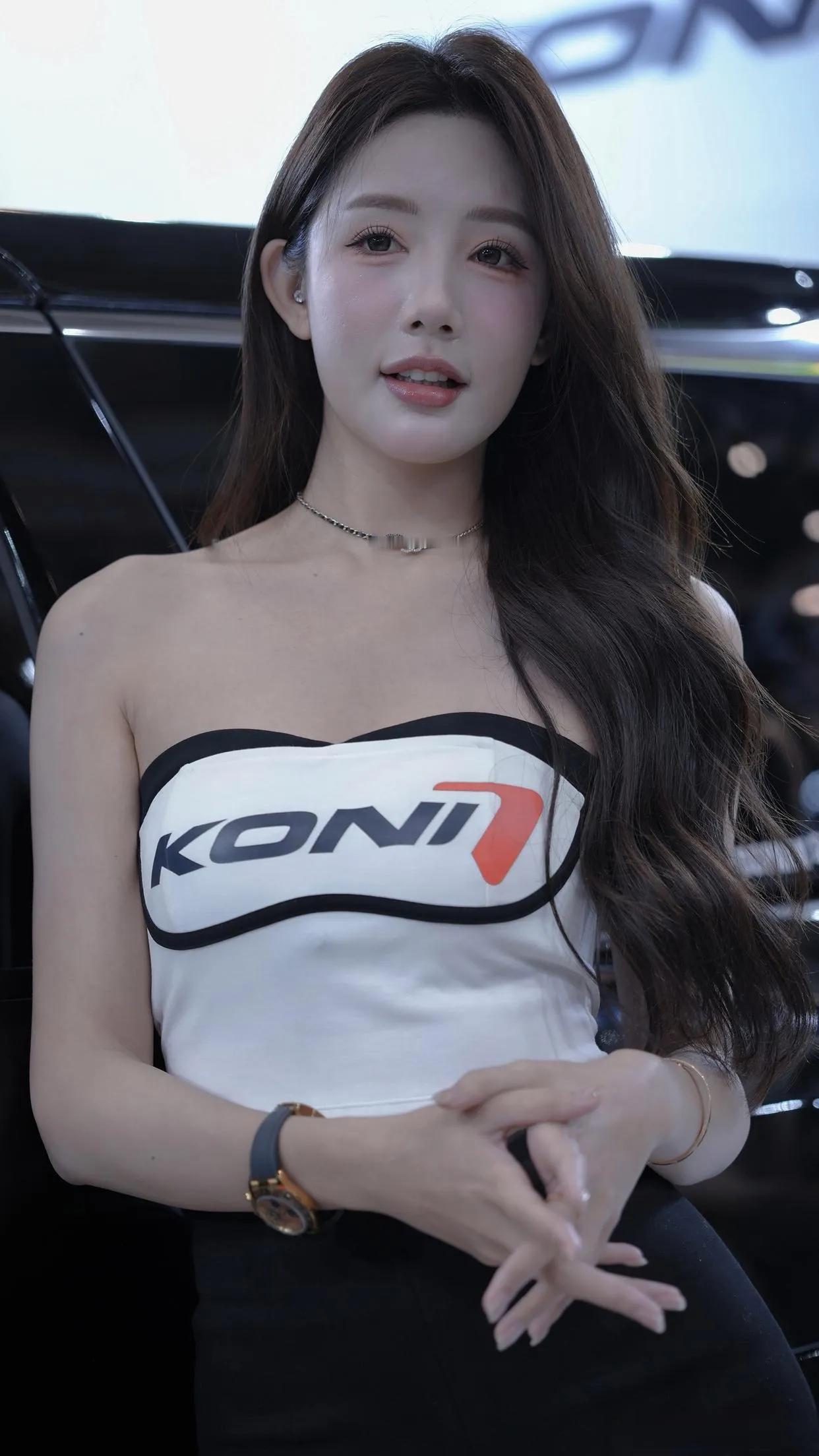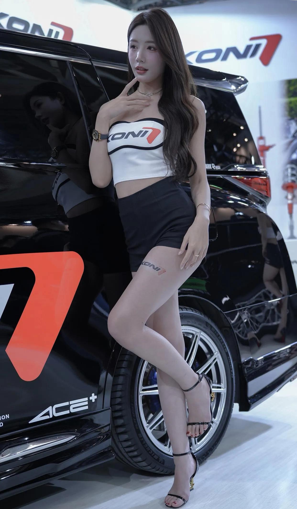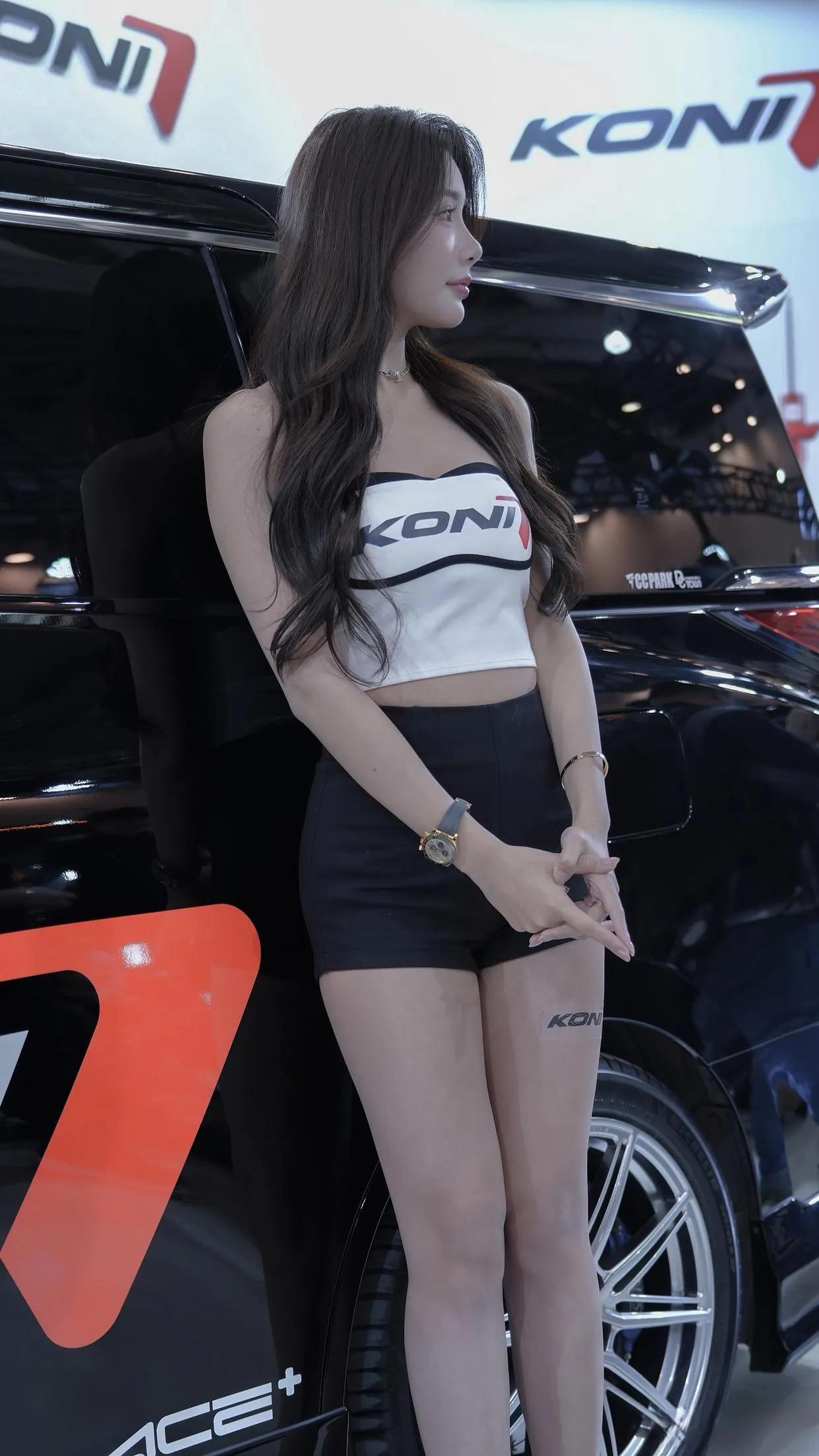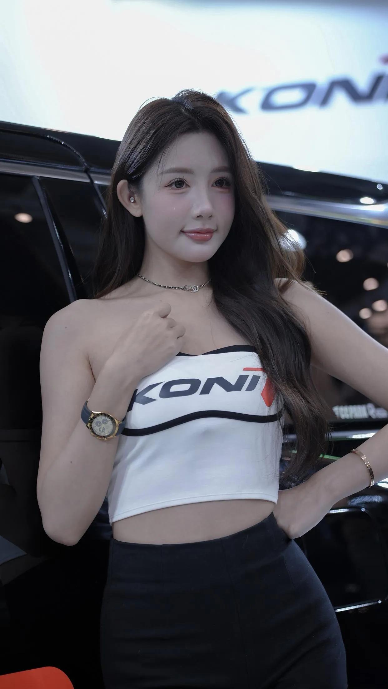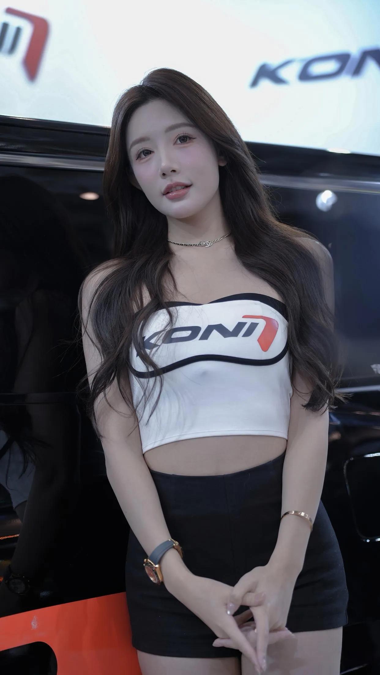 什么样的穿搭可以成为气质女神? 美女身着简约却不失设计感的抹胸上衣,搭配经典黑色短裤,简约中尽显时尚与活力,是车展上亮眼吸睛的存在。