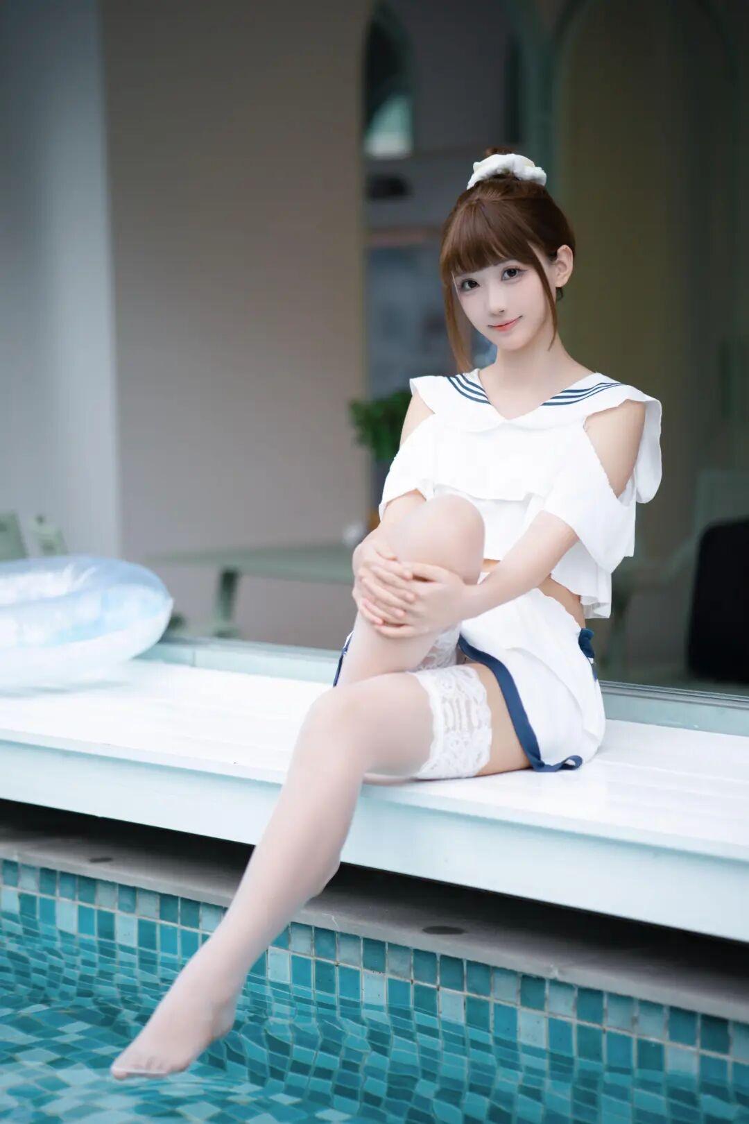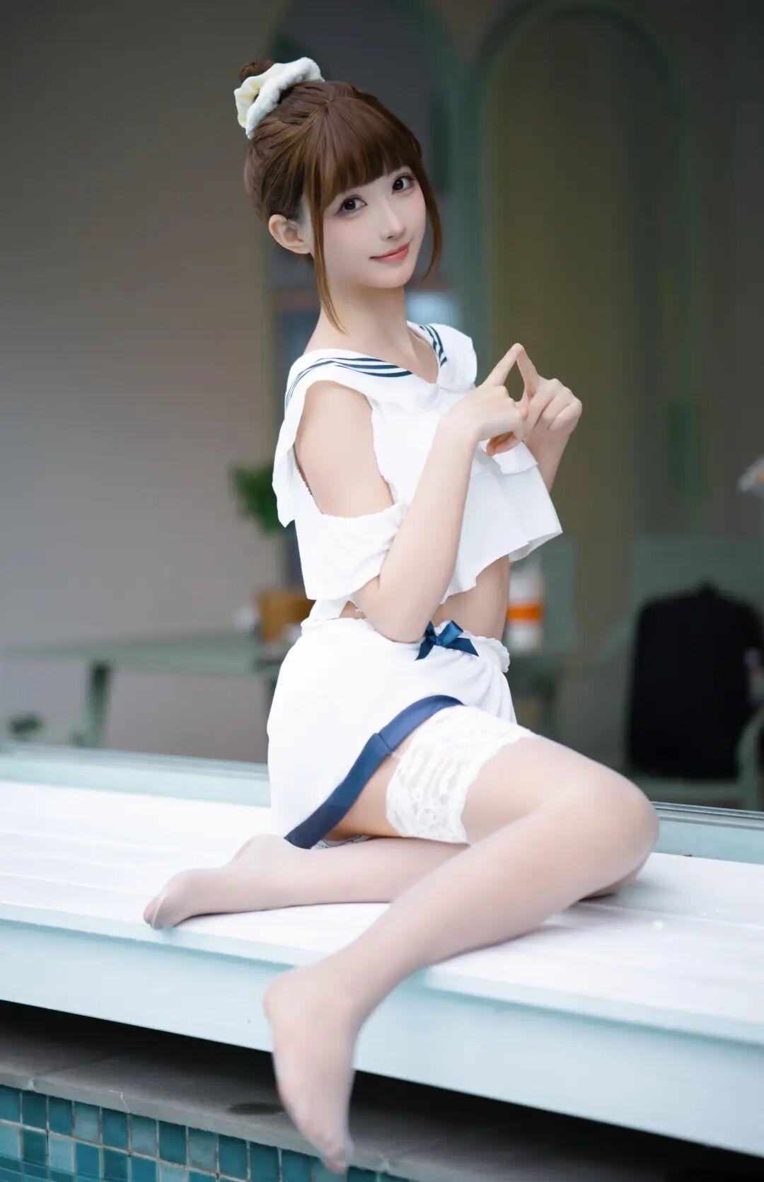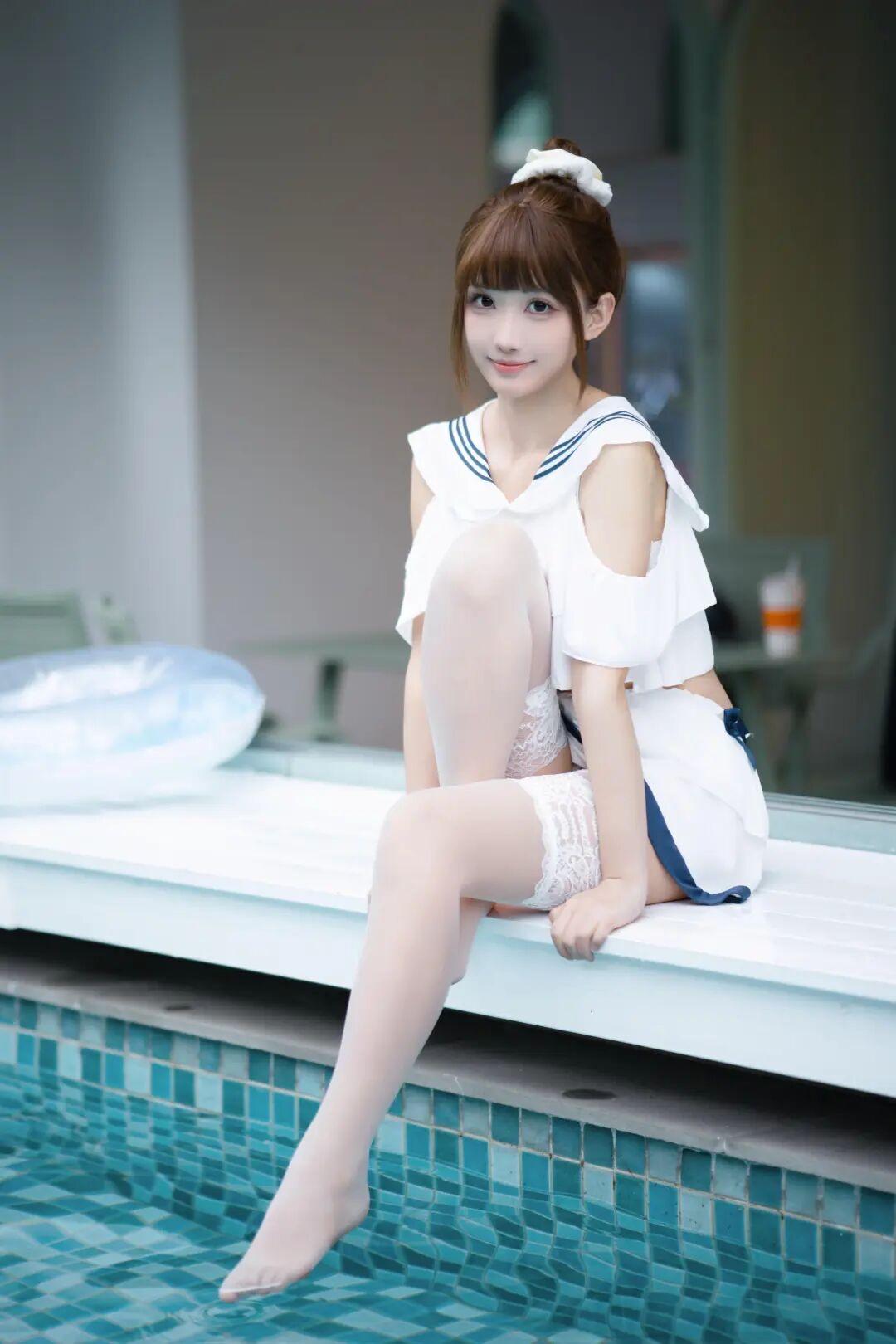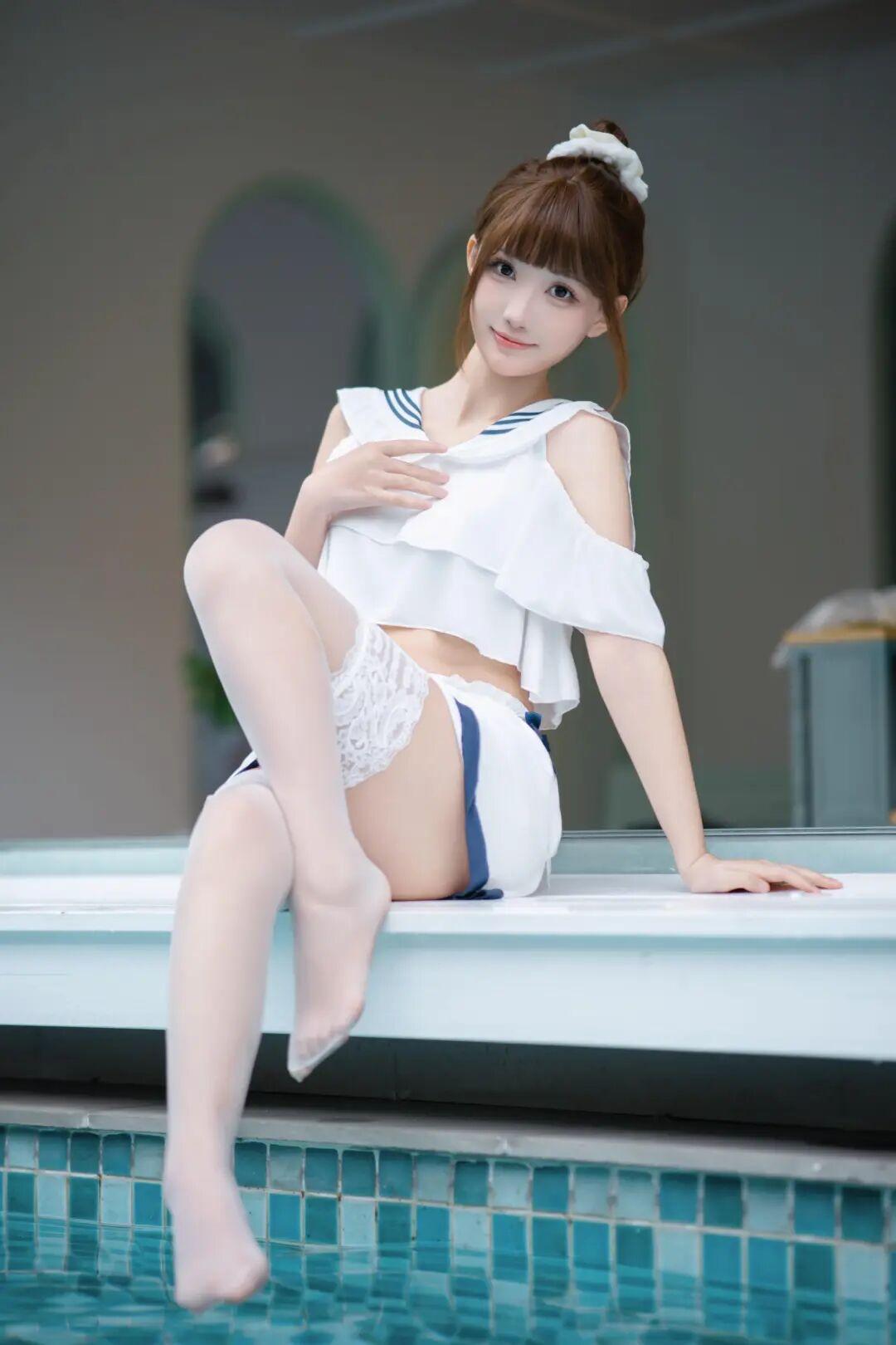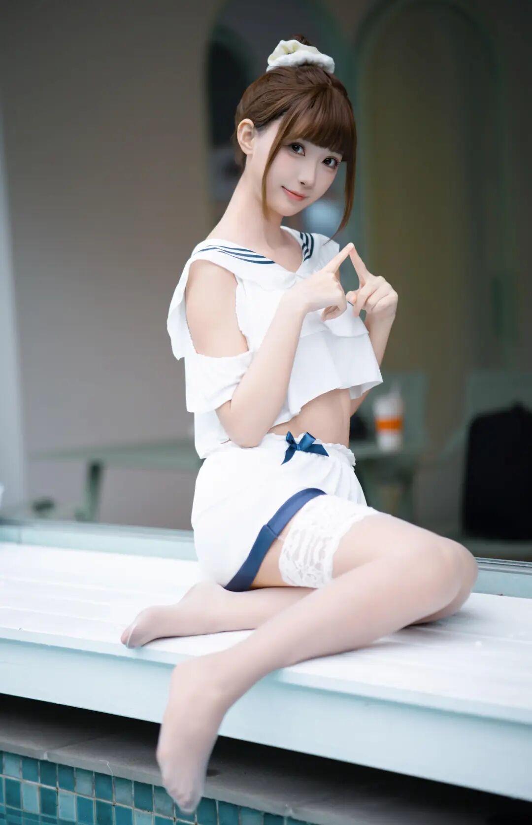 性感与可爱并存是什么体验? 女人味的魅力在哪里? 白色蕾丝美腿泳装写真