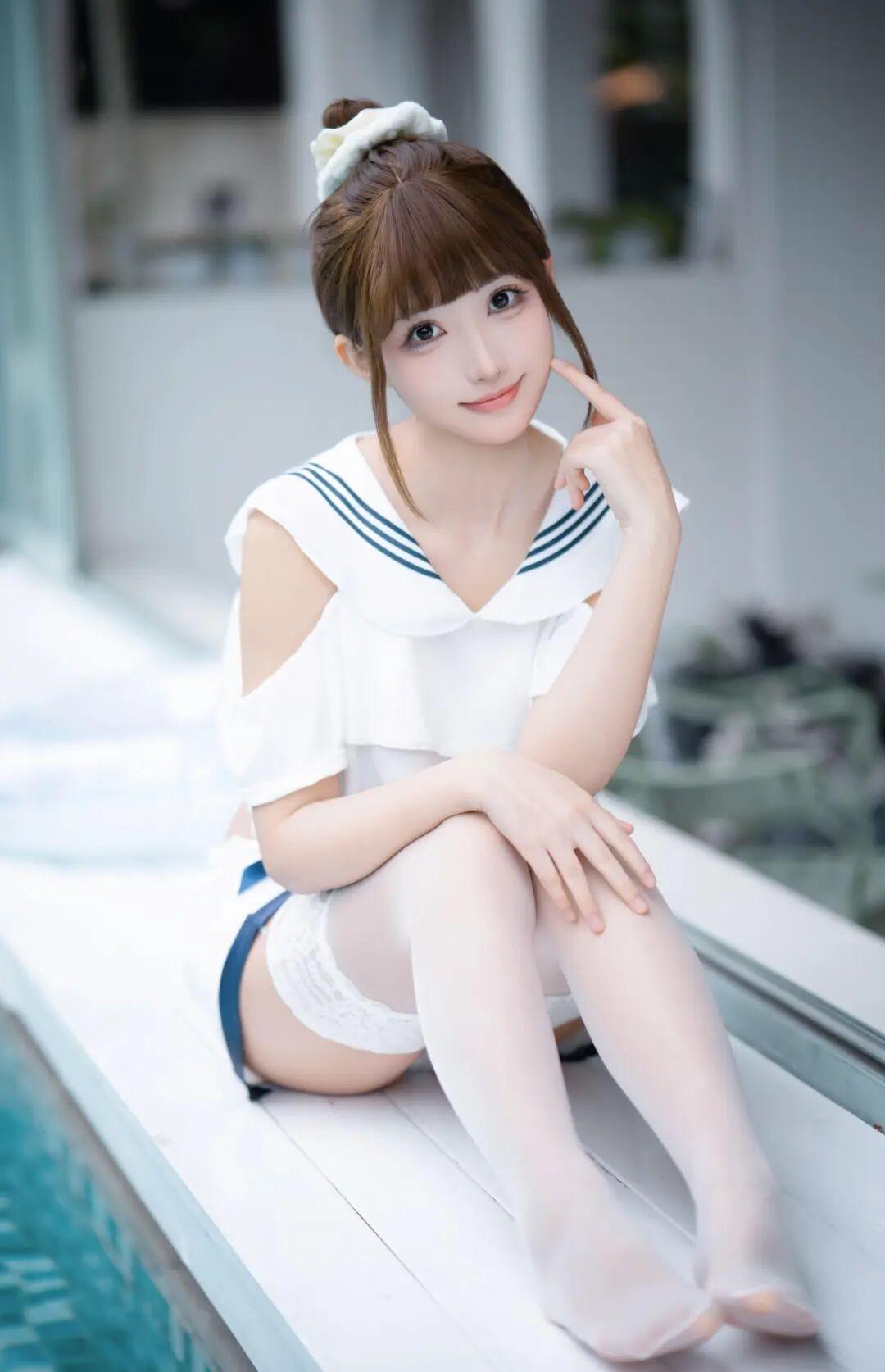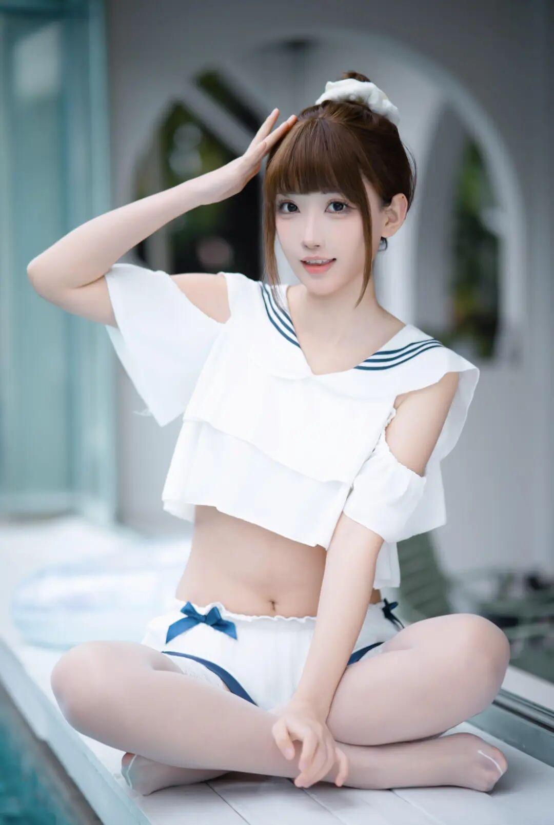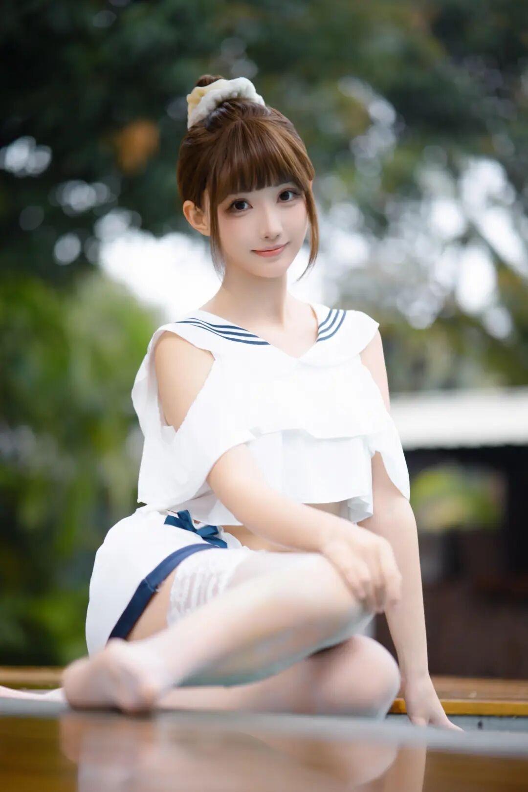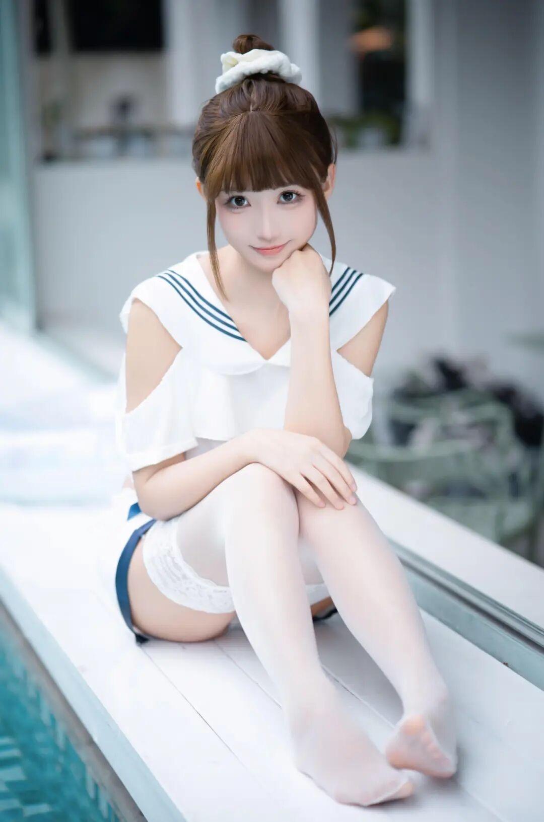 性感与可爱并存是什么体验? 女人味的魅力在哪里? 白色蕾丝美腿泳装写真