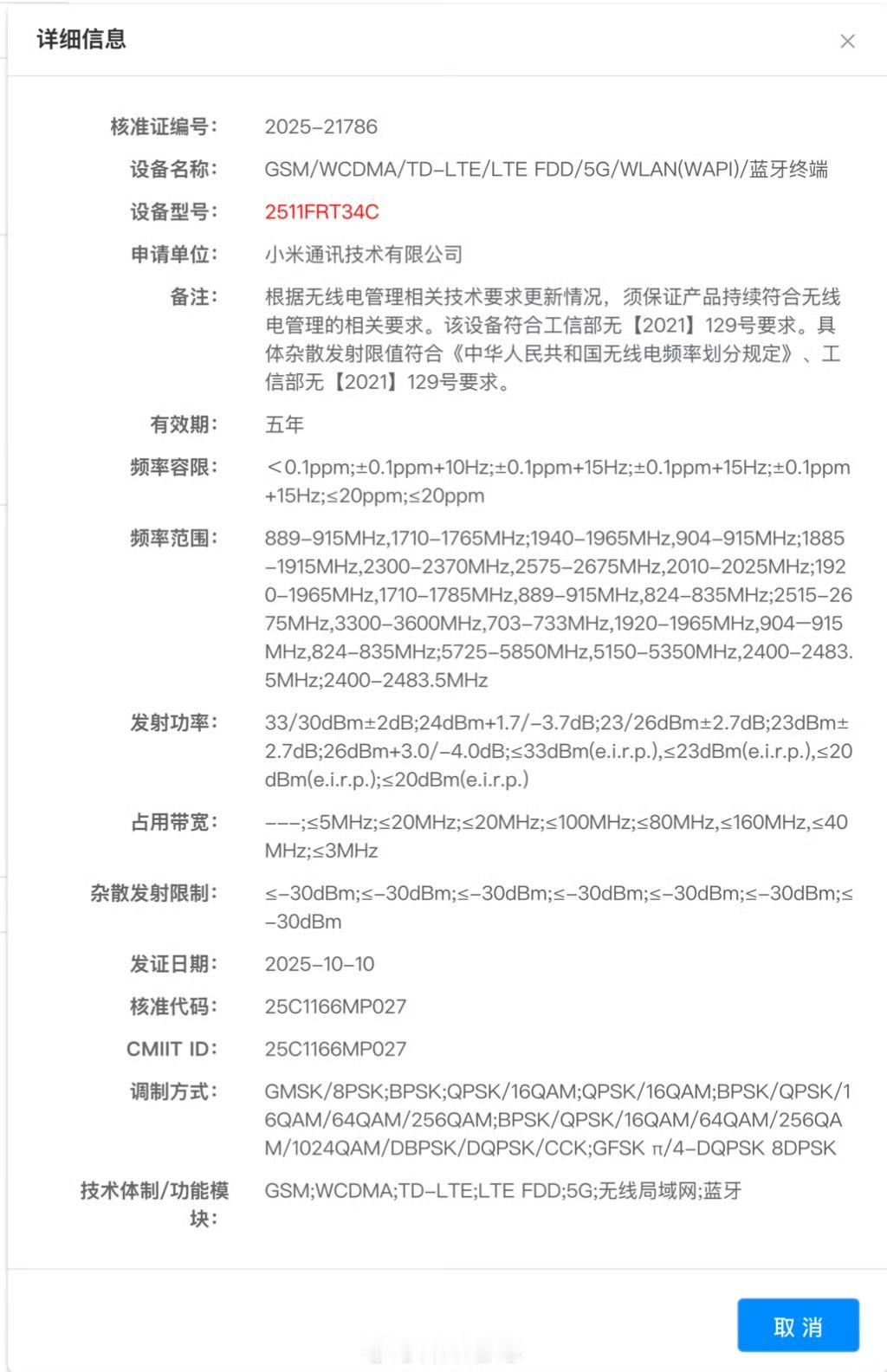 型号2511FRT34C的红米手机入网,应该是REDMI Tubro5,预计12月发布,网传配置↓ - 天玑8500处理器 - 6.6英寸1.5K直屏+金属中框 - 超7000mAh大电池 型号25128PNA1C是小米17 Ultra双卫星版,也是预计12月发布。