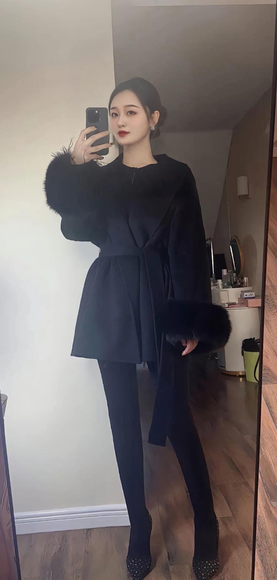 都市时尚女孩,石墙前摆pose,黑衣配豹纹短裙,高跟鞋与包包点缀,自信满满!