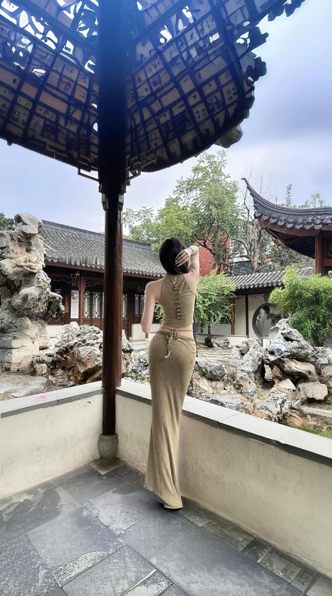 古风庭院中的优雅女子,静谧时光的美好瞬间。
