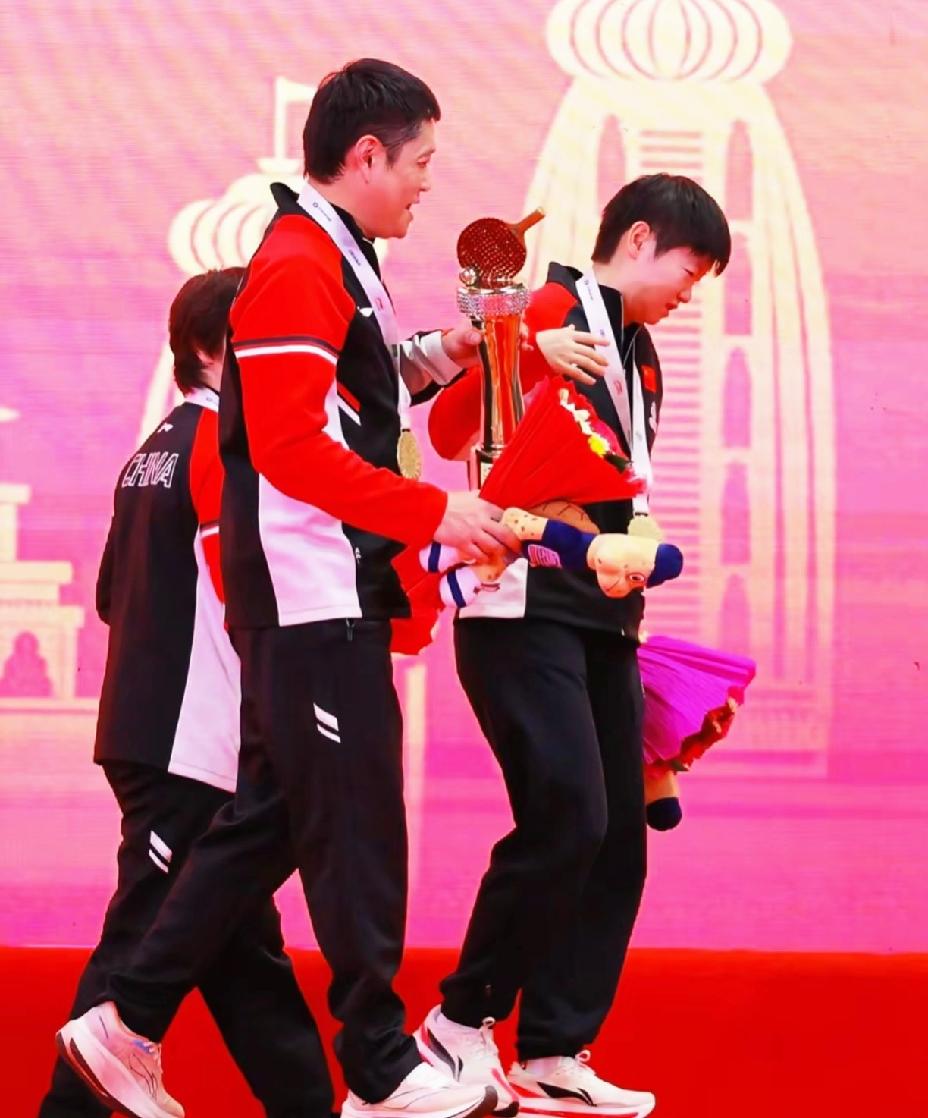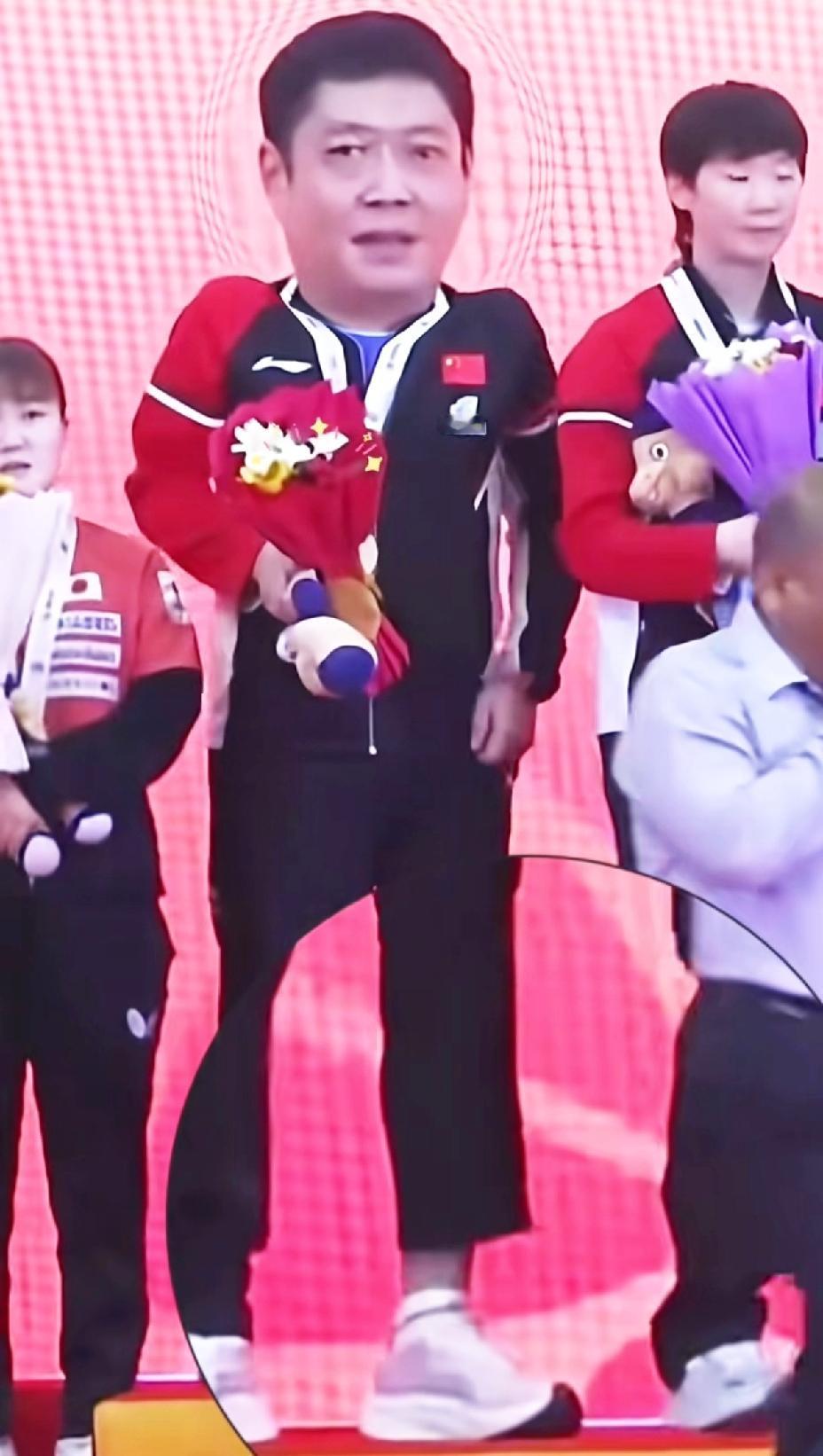 要说邱贻可真是“命苦”, 不仅要给帮莎莎扛奖杯, 还要帮方博卖袜子, 真是逗得网友们哈哈大笑。 亚锦赛女团颁奖仪式, 颁奖嘉宾执意让莎莎捧着奖杯。 当时我就在想一会下了台, 莎莎绝对会让Coco扛着奖杯。 看来是我想多了, 还没有走下台, 奖杯就到了Coco的手里。 只见莎莎“一脸嫌弃”的模样, 好像在说:“你赶紧拿着吧,还挺沉。” 在领奖台上, Coco时不时提一下裤子, 当时我还纳闷是不是裤子有啥问题。 原来方博给邱贻可发信息让他露出袜子, 帮他打广告。 我说怎么Coco又是摸鼻子, 又是摸脖子的, 原来他是不好意思, 在找提裤子的最佳时机。 Coco呀Coco, 你真是个“憨憨”, 咋那么听话哩, 快被他提裤子的动作笑死了。 (图片源自于网络)