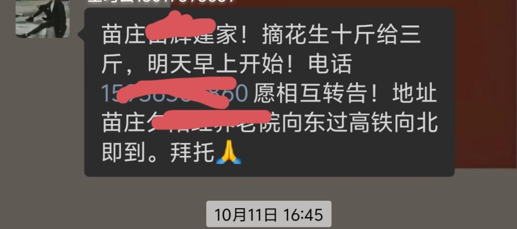 你们那儿的花生都收了吗?我们这儿天晴了两天,可又开始下雨了。前两天说拔花生十斤送三斤,按三七分,如今已经变成五五分了。婆婆还让我请两天假,说现在花生一斤五六块,叫我跟她一块儿去拔花生。 花生