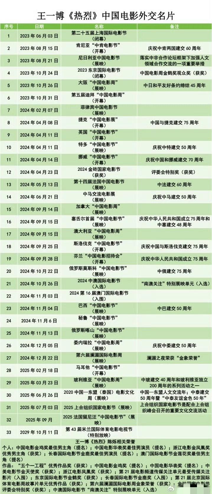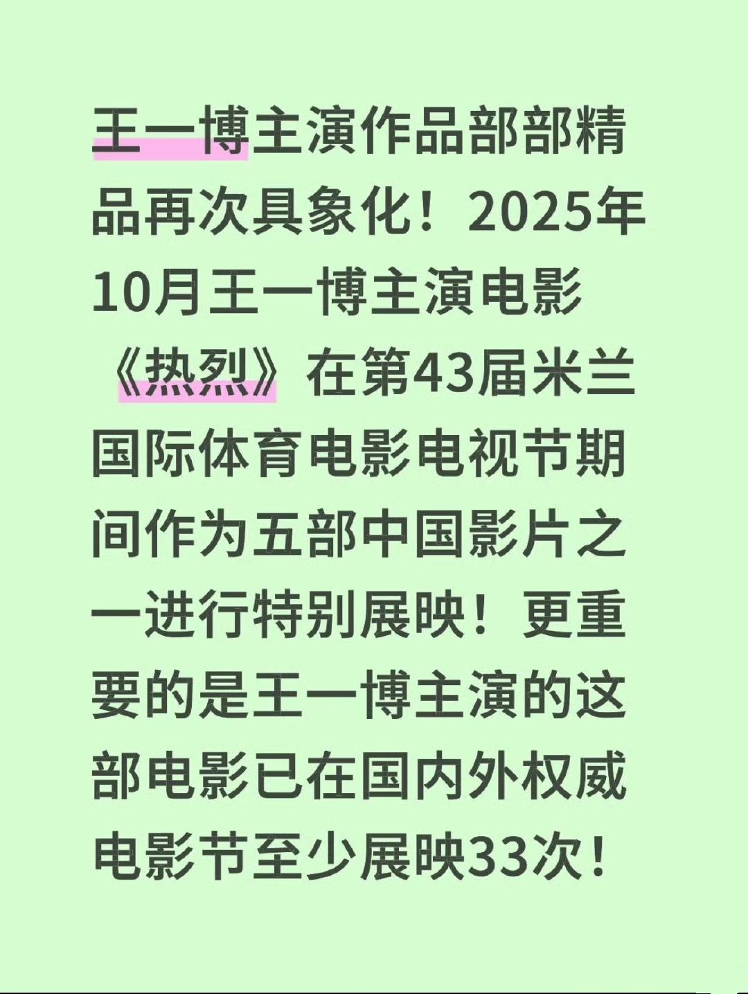 王一博主演的电影《热烈》真正的国际影响力还在上升[赞]! 《热烈》作为代表影片在第43届米兰国际体育电影电视节期间特别展映!截止目前王一博的《热烈》已在国内外权威电影节至少展映33次! 真正有效的文化输出和海外宣传的主流担当,从来不是粉圈自嗨。有了王一博才有了《热烈》,好演员成就好作品[赞]。 王一博