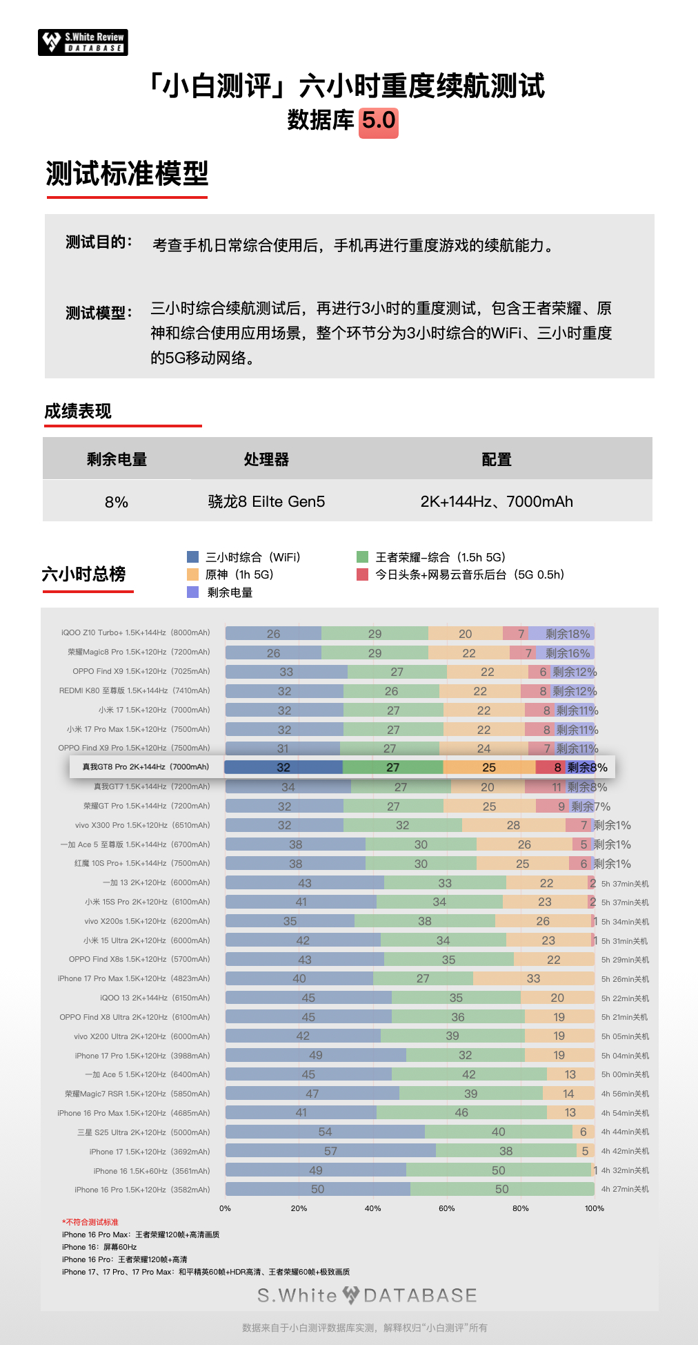 即将21日发布的真我GT8Pro,作为首批骁龙8E5旗舰,配备7000mAh+120W有线+50W无线的续航组合,另外屏幕还是2K分辨率。它在续航上到底怎么样?数据库5.0实测如下: