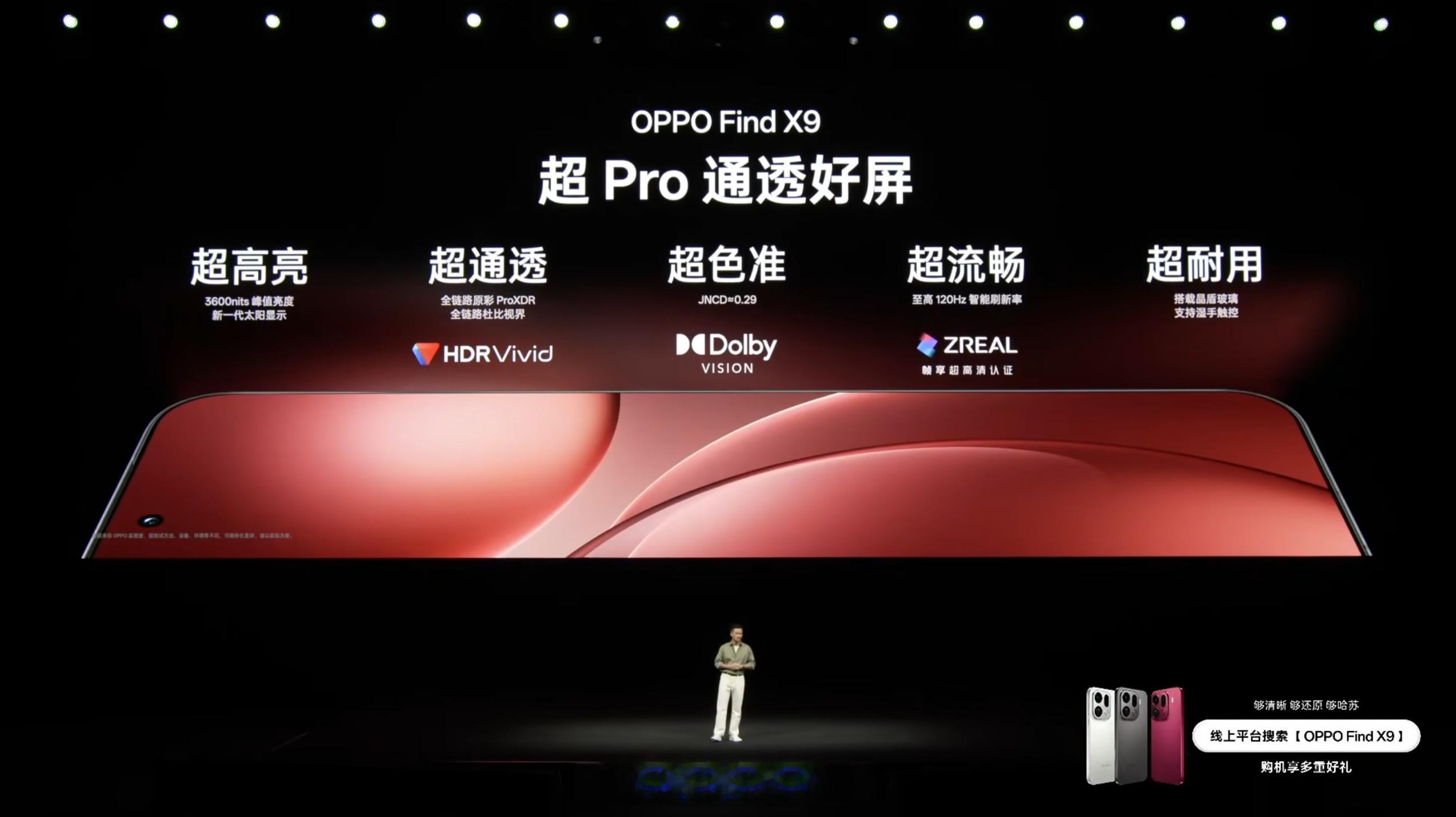OPPO Find X9 标准版尺寸和上一代一样,6.59 英寸 2760×1256 OLED 天马 OLED 直屏,全局激发亮度 1800nit,20% 窗口峰值亮度 3600nit,最低 1nit 亮度,支持 120Hz 刷新率,240Hz 触控采样率,3840Hz 高频 PWM 调光,支持 10.7 亿色,OPPO 晶盾玻璃,1.45mm 极窄边框。