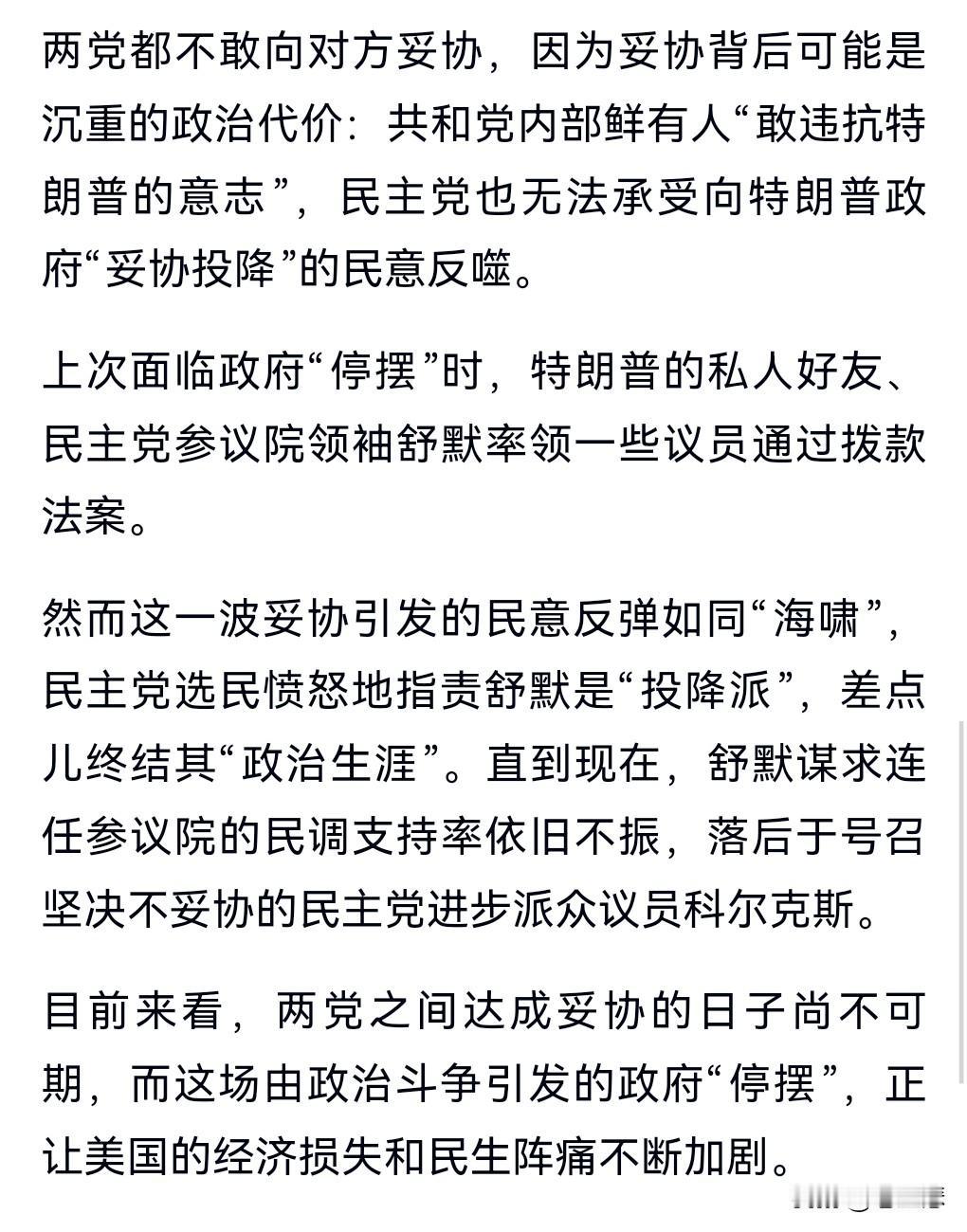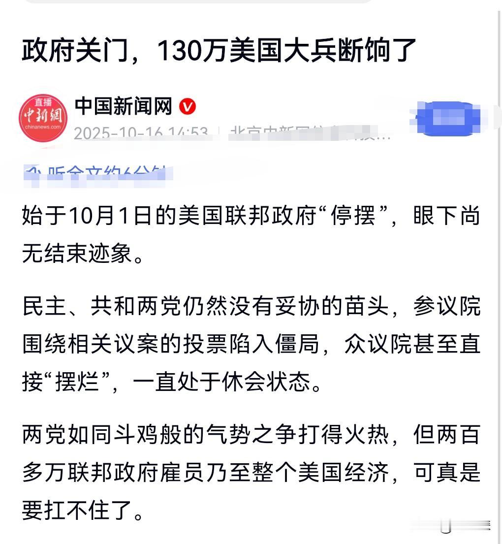 想不到如此离谱的事竟然发生在头号大国美国的身上。 10月16日闲来无事,在网上看到这么个消息。 政府关门,130万美国大兵断饷了。 想不到军人的钱都不发了,这就是美国政府停摆的后果。 这就是两党之争带来的恶果。 如果不妥协的话,那真的是损失惨每周就要损失上百亿美元。 虽然早晚会妥协,但两党之争非常厉害。政府关门 130万美国大兵断饷了