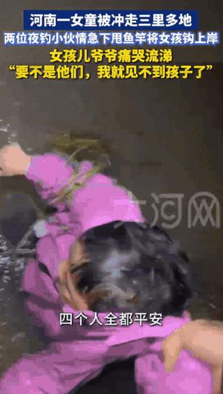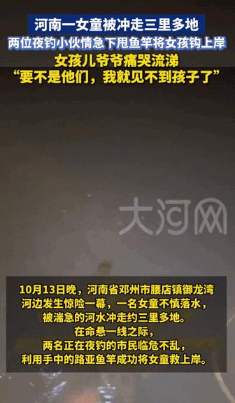 “刻在骨子里的善良”10月14日河南,两位小伙子喜欢夜钓,当时正在河边钓鱼,突然二人看到河道上游飘来一个红色不明物体,二人定睛一看,是一个女童,女娃还在不断蹬着腿,划拉着小手,看来还活着,二人多次尝试去救助小女孩,但是都没有成功,小伙子想到,用钓鱼竿钩住孩子的衣服,慢慢拽向岸边,最终女童被成功搭救。[无辜笑] 当晚水流湍急,水温较低,两人正在岸边钓鱼时,发现河面漂来一个红色物体。 红色物体逐渐靠近,他们惊讶地发现那是个穿着红色羽绒服的孩子,女孩面部朝上,双手在不断划水,依靠羽绒服的浮力勉强保持漂浮,由于河道较宽,两人立即尝试救援。 他们先是俯身试图伸手拉住孩子,但距离不够,其中一人脱下外套准备下水,但急流让他无法站稳,只能退回岸上,此时女孩正被水流带向更远的下游。 情急之下持鱼竿的小伙想到用鱼钩钩住衣服的方法,他迅速换上带多钩的钓组,小心地向女孩方向抛竿,前两次尝试都未能钩住,第三次抛投时,鱼钩成功挂住了女孩后背的羽绒服。 两人配合着缓慢收线,尽量保持力度均匀,避免鱼钩伤到孩子,约三分钟后,女孩被拉至岸边,他们立即伸手将她抱上岸,孩子浑身湿透,冷得直打哆嗦,他们赶紧用干燥的外套裹住她,并拨打了报警电话。 警方赶到后告知,上游还有女孩的爷爷奶奶和弟弟落水,后续消息确认,另外三人已自行安全上岸,据了解这家人当晚在河边散步时发生意外。 次日被救女童的爷爷通过警方联系到两位救人者,老人情绪激动,紧紧握住他们的手反复道谢,他表示若不是两人果断救援,后果不堪设想。 整个救援过程约十二分钟,鱼竿在这起意外中发挥了关键作用,专业人士表示,在无法直接接触落水者时,利用长杆类物品确实是有效的救援方式。 这起事件提醒公众,在水域附近活动时需特别注意安全,尤其要照看好儿童和老人,避免靠近水流湍急的区域,同时掌握基本的应急救援方法也很重要。 若遇到类似情况,在保障自身安全的前提下,可尝试使用长树枝、绳索等物品进行救援,同时要第一时间呼叫专业救援力量,任何延误都可能影响救援效果。 网友们赞叹不已: “真是万幸孩子遇到了他们,不然后果不敢想,给两位小哥点赞!” “夜钓还救了人,这鱼竿用得比钓鱼值多了!好人一生平安!” “羽绒服这次真立功了,要不然孩子可能撑不到被发现,家长一定要看好小孩啊!” “救援方法太机智了!不过说真的,一般人遇到这种情况可能都慌了,这俩哥们儿冷静得让人佩服。” “建议给这俩小伙子评个见义勇为奖,这反应速度和行动力不是谁都有的。” “看完心里暖暖的,世界上还是好心人多啊,希望这样的正能量能被更多人看到!” 除了用鱼竿,大家觉得在保证自身安全的情况下,还有什么方法能救援落水者? 官方信源:央视新闻
