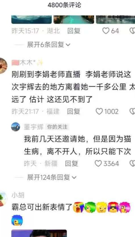 董宇辉正面回应了,李娟老师和宇辉不在新疆见面了。 新疆阅山河官宣后,有网友在视频下说: 刚刚到李娟老师直播间,李娟老师说这次宇辉去的地方离她1000多公里,太远了,估计这次见不到了。 董宇辉在留言下回复说: 我前几天还邀请她,但是因为猫生病,离不开人,所以只能下次。 自从上次李娟和董宇辉直播以后,大家都意犹未尽,非常希望他俩能再同框一次。这次董宇辉去新疆,大家想再见到李娟老师,也是情理之中的美好愿望,有遗憾也有希望,也许下一次会来直播间吧。
