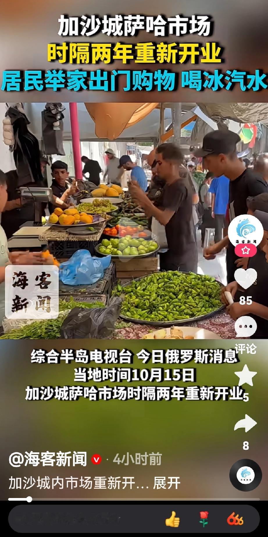 加沙城萨哈市场开业了,可以买水果,蔬菜,逛集市了,真好! 根据俄罗斯媒体报道,加