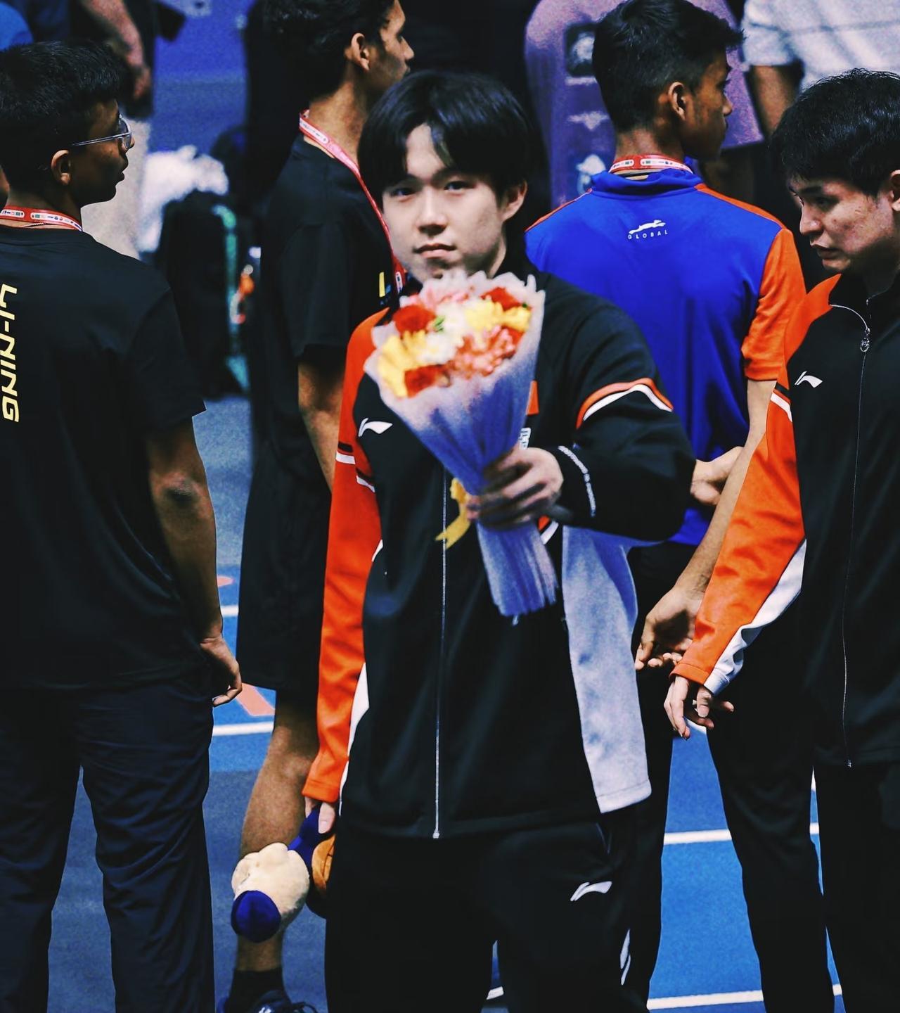 这张照片值得被珍藏, 这是亚锦赛拍得最好的一张照片, 大头看到了应该也会收藏吧, 去看亚锦赛的中国球迷并不多, 所以在为数不多的人里面, 大头挑中了作者, 想将花送给她, 而作者忙于拍摄没有反应过来, 于是错过了大头的花, 但却留下了一个无比温柔的送花少年, 这眼神真的温柔得出水, 这是看到自己同胞后的温情, 也是发自内心对球迷的尊重。 这样的大头实在是太好看了!