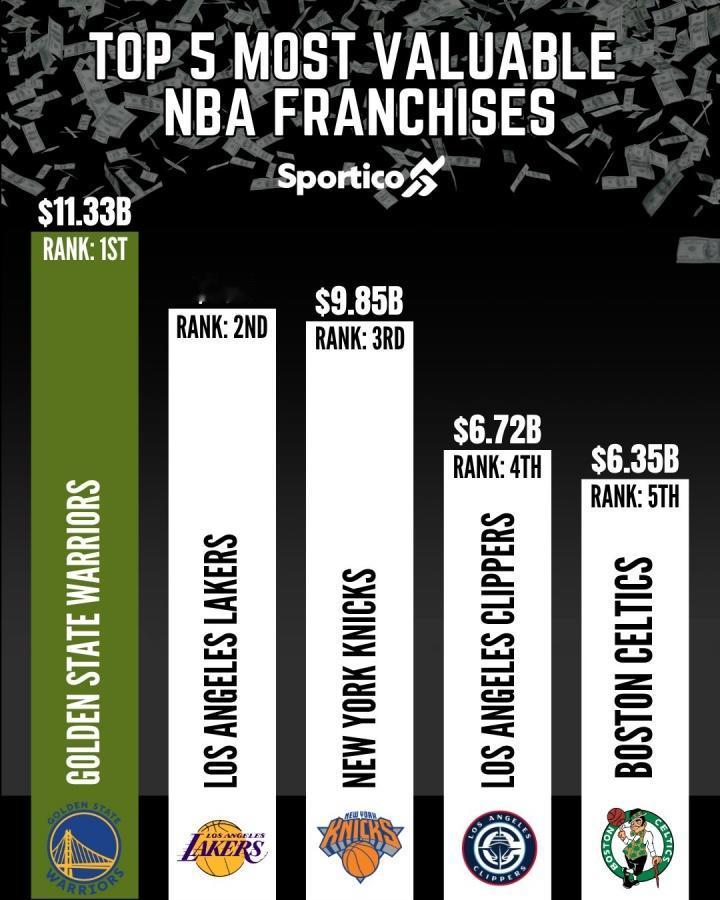 勇士最新估值高达113.3亿美元,库里一人就贡献了110亿美元! 刚刚,美国权威机构发布了2025年NBA球队最新估值排行榜,其中勇士以113.3亿美元高居榜首, 成为NBA最值钱的球队,放眼全世界,也只有128亿美元的NFL球队达拉斯牛仔比勇士高了。 众所周知,2009年库里加盟勇士的时候,勇士估值只有3.15亿美元,在NBA属于垫底,没想到库里一己之力把勇士带到了NBA第一世界第二,不得不说库里真的是太伟大了,勇士113.3亿美元里面库里一人就贡献了110亿美元。 NBA迎来了最富有的时代,垫底的灰熊都估值40亿美元,30支球队球队平均估值高达55.1亿美元,比去年提升了20%,不得不说NBA发展越来越好了,球员工资越来越高,老板的资产也越来越多,球迷也看的越来越上瘾了。