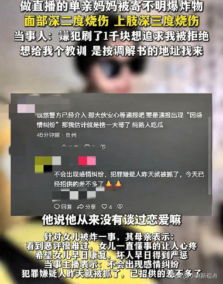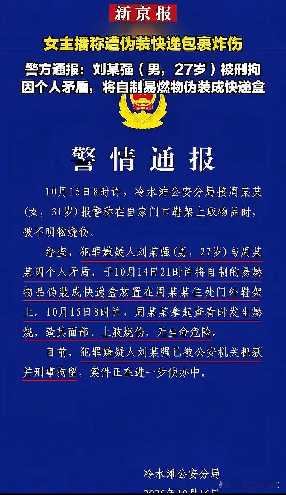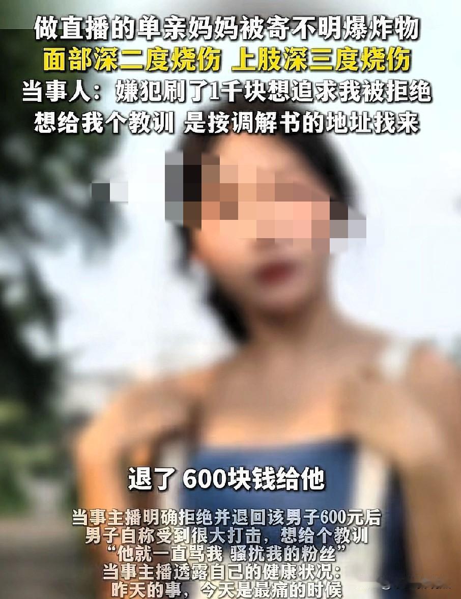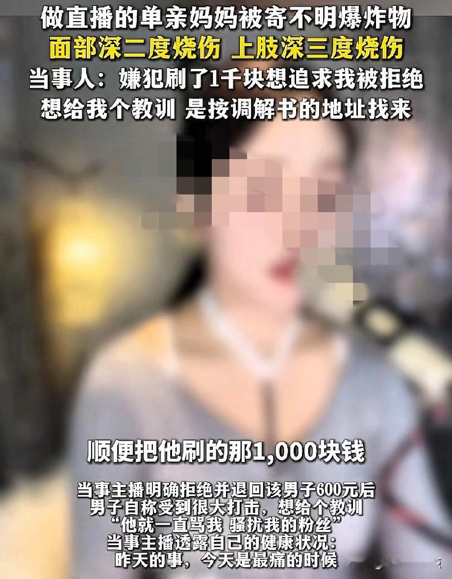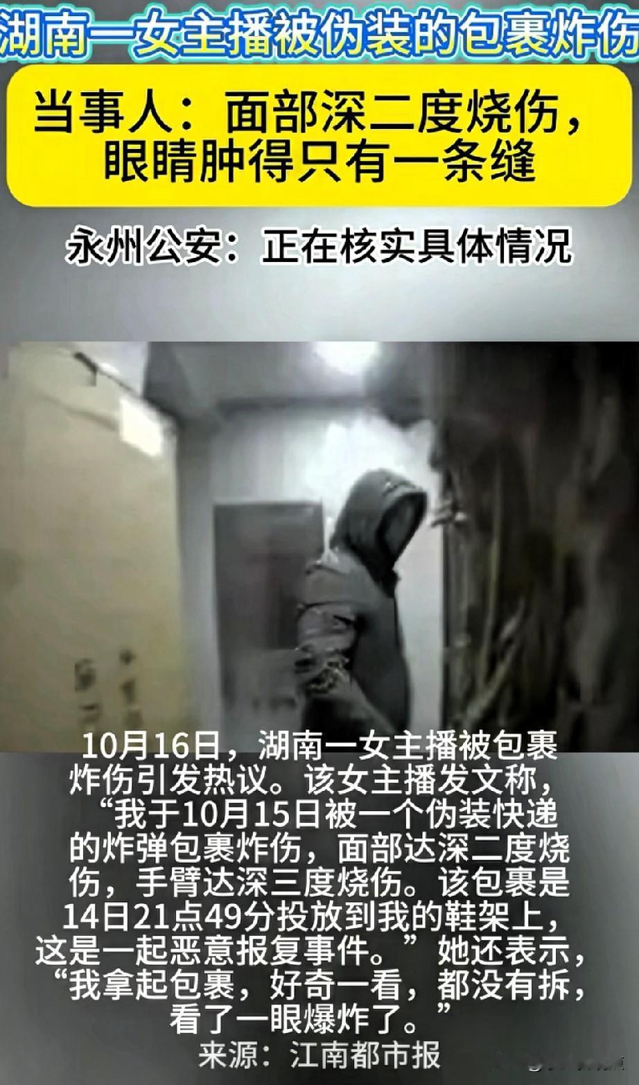 大家不要乱猜了,被伪装包裹炸伤的女主播,不是因为什么特殊原因被炸伤的,是因为她和一个27岁男子产生了个人矛盾。 那名男子自制了易燃物品伪装成快递,放在女主播的门口,女主播拿起查看时,被炸伤了。 还是有点不敢相信啊,究竟是什么矛盾?才会让这名27岁男子做出这么疯狂的举动来。 10月14日,一名看不清容貌的男子手拿一个类似快递包裹的物品,出现在女主播的门口。 这名男子戴着口罩,穿着灰色带帽子的上衣,并把帽子戴在头上,可以说是遮盖的严严实实的。 他走到女主播门口后,把手中的“包裹”放在鞋架上后,就离开了。 女主播呢,在她出门的时候,看到鞋架上有一个包裹,也没有多想,就拿起来查看。 可是这不看不要紧,刚拿起来看,这个包裹突然就燃烧了,女主播躲闪不及,面部还有上肢就被烧伤了。 10月15日,女主播就报警了,叔叔也十分给力,这才一天就查清楚了,犯事者被抓起来,并刑事拘留了。 10月16日的警情通告中也解释了,这名男子因为和女主播有个人矛盾才做出这么疯狂的举动来。 女主播也发声了:“男子给我刷了1000元,说要追求我,要给16万,先给4万,确定关系之后再把12万给我,当时就拒绝了”。 而且女主播还说:“刷的那1000元,退了600元给他,他大受打击,说要报复”。 有个问题啊,隔着网络,男子是怎么找到的女主播呢? 说实在的,感情这个东西,讲究的就是你情我愿的,人家拒绝了,没有同意你的追求,真没必要做出这么疯狂的举动来。 这下好了,你以为戴着帽子,戴着口罩,就找不到你了吗?现在技术这么先进,一查一个准。这不,还没几天就抓到了。 后续,还要面临着道歉赔偿,最主要的是被刑事拘留了,接下来会面临什么不用多说吧,一辈子都有污点了。 这种人遇到事情,也太不理智了,什么事情能做,什么事情不能做都不知道,真太离谱了。相信他会受到应有的惩罚的。 来源:江南都市报、风芒新闻、新京报