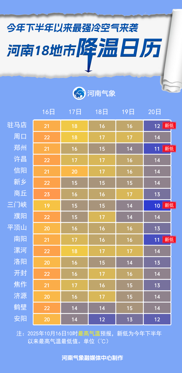 今后五天最高温度的最低点出现在20日白天,尤其是郑州(最高气温仅为11℃)、驻马店、南阳、三门峡的最高气温将创今年下半年来的新低。