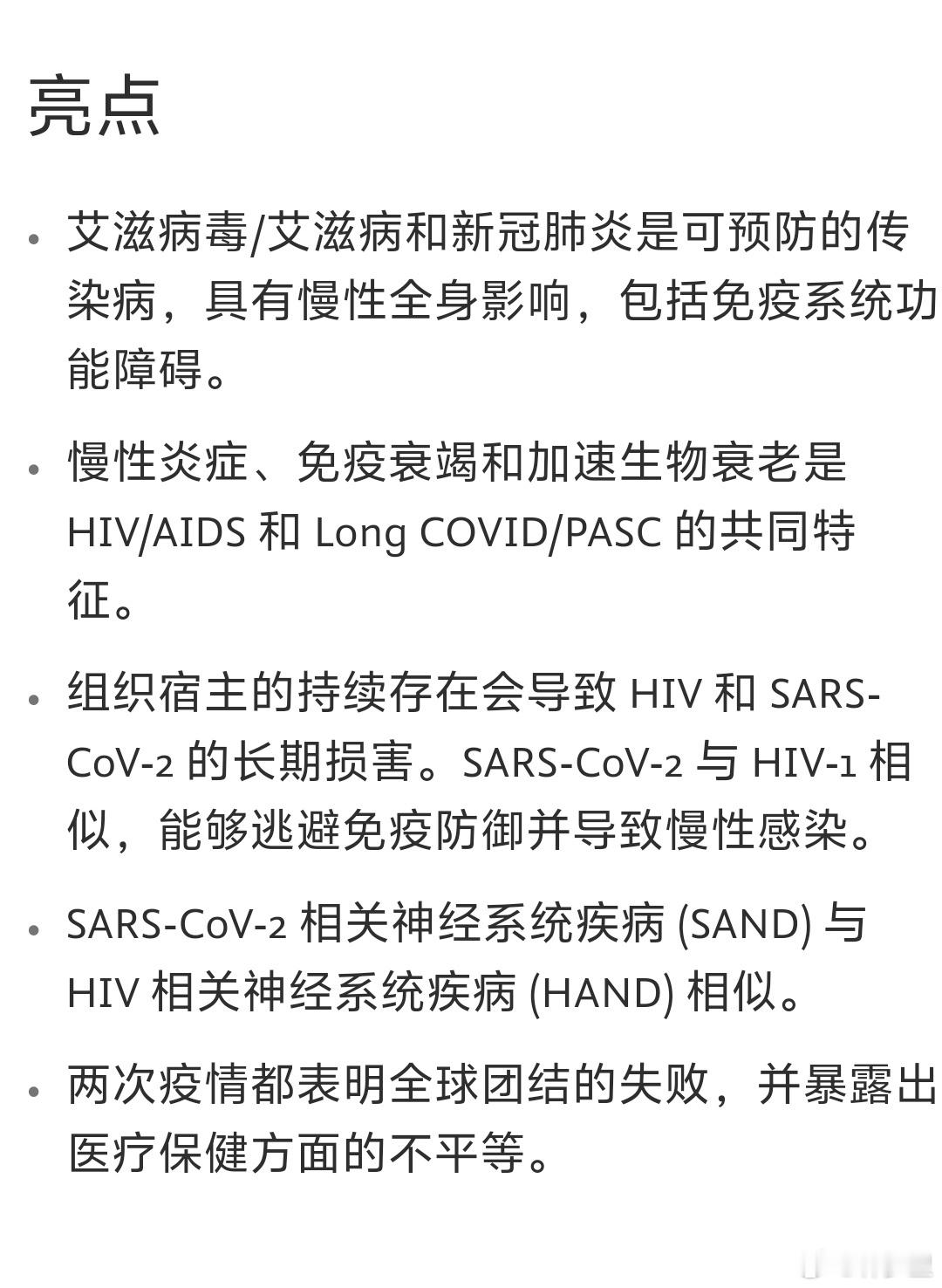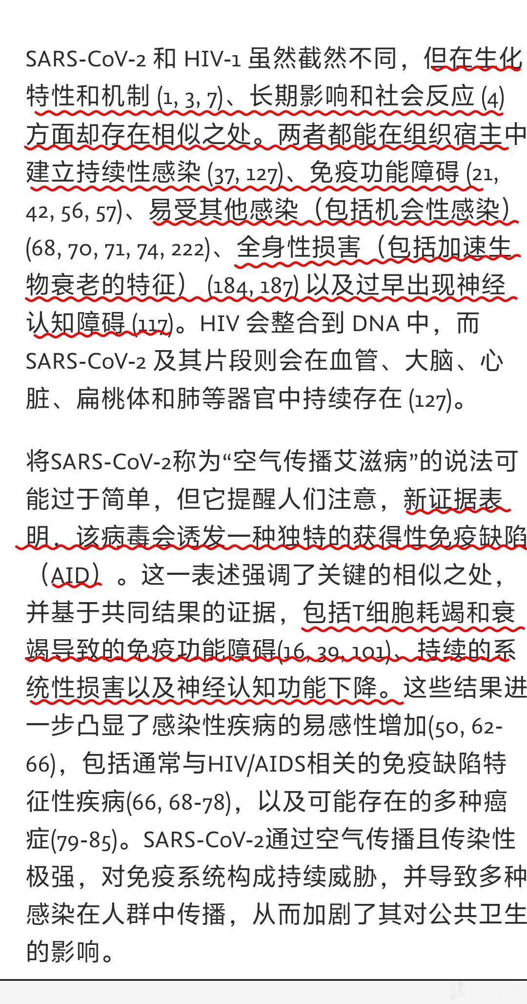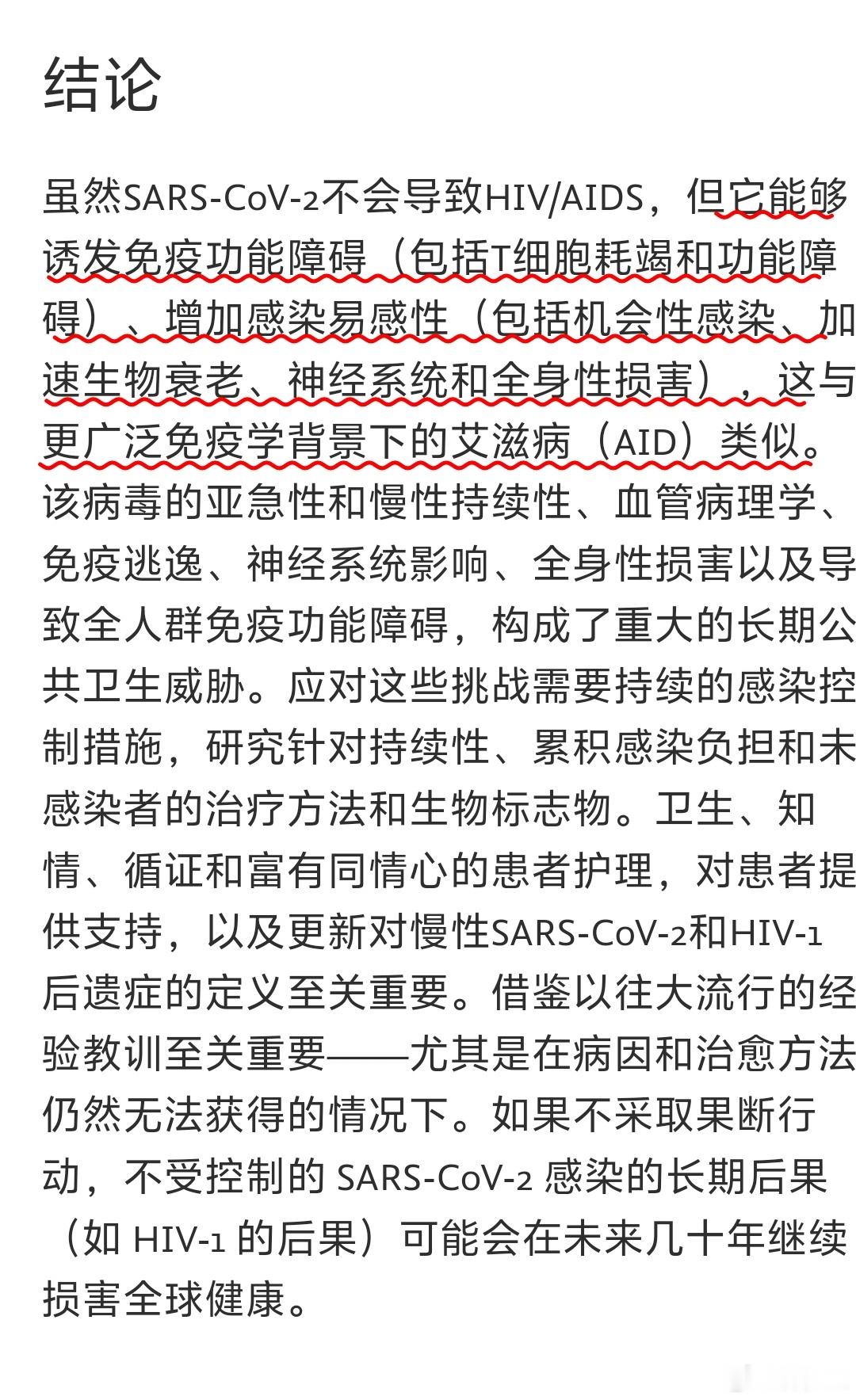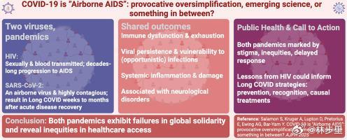 新冠能够导致的免疫功能障碍(包括T细胞耗竭)、增加感染易感性(包括机会性感染)、加速生物衰老、神经系统和全身性损害,这与免疫学背景下的艾滋病(AID)类似。
