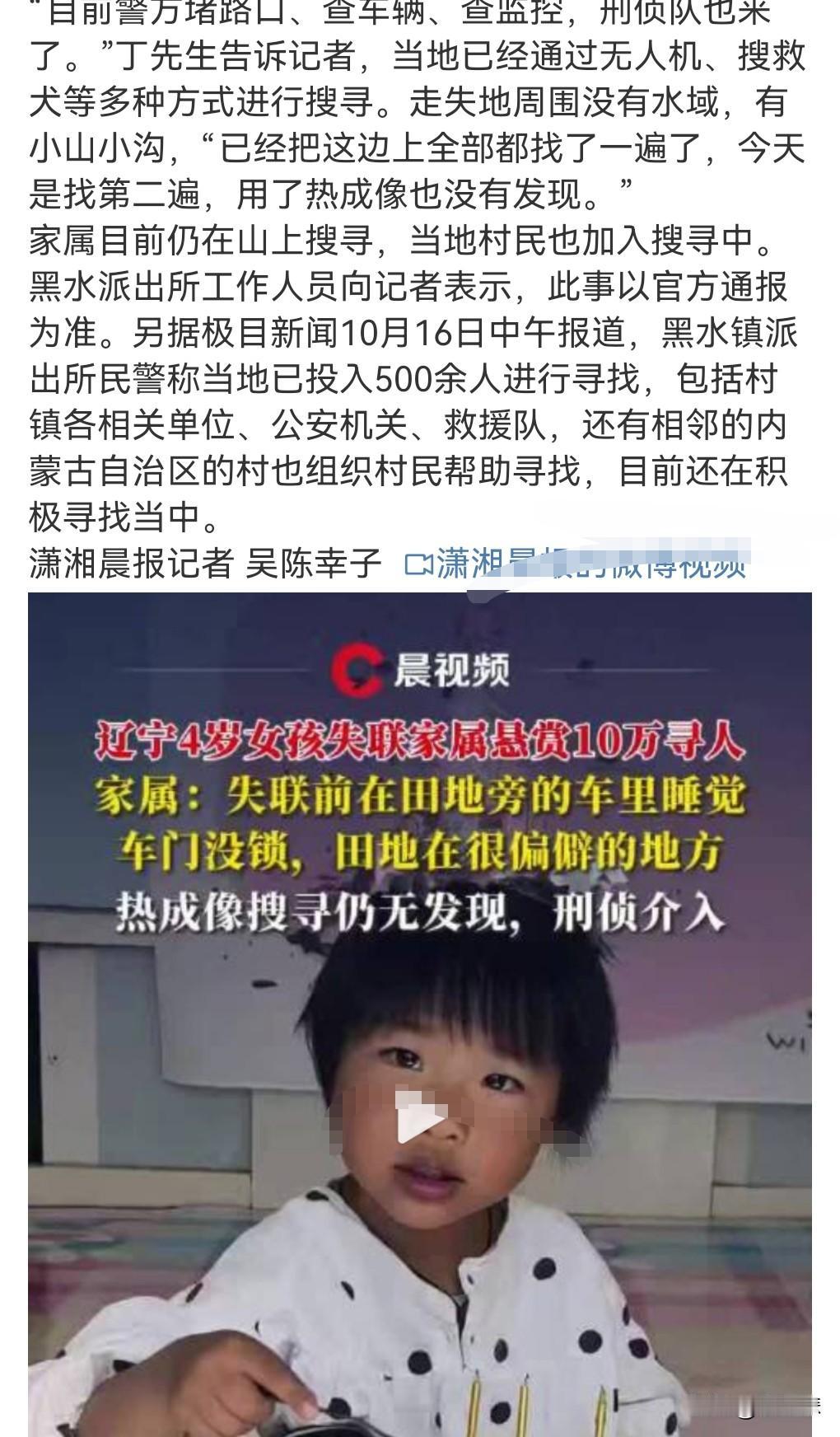 这真的是防不胜防,也敲响了警钟,何时候都不能够大意。 10月16日(发布),网上一则消息显示,4岁女孩车里睡觉失联。 当时车窗户留了一个缝隙,她的爷爷每半小时就过来看一下,当时还在车里,后来女孩翻出窗户失联了,也不知道是走丢了还是被抱走了。 家属非常的担心,4岁女孩车里睡觉失联家属悬赏10万。 爷爷更是表示愿意放弃所有财产,只要能找到。