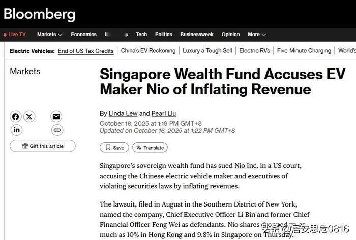 10月16日,据彭博消息,蔚来遭新加坡主权财富基金起诉,股价放量大跌13%。近日,新加坡主权财富基金——新加坡政府投资公司(GIC)已在美国法院对中国电动汽车制造商蔚来及其高管提起诉讼。 这起由GIC发起的诉讼,将蔚来公司、其CEO李斌以及前CFO奉玮列为被告。GIC指控蔚来通过与宁德时代等成立的蔚能电池资产公司,涉嫌夸大收入和利润,并隐瞒对蔚能的实际控制关系,误导投资者导致其蒙受损失。目前,法院已暂缓审理此案,将等待美国投资者发起的集体诉讼案结果后再作处理。