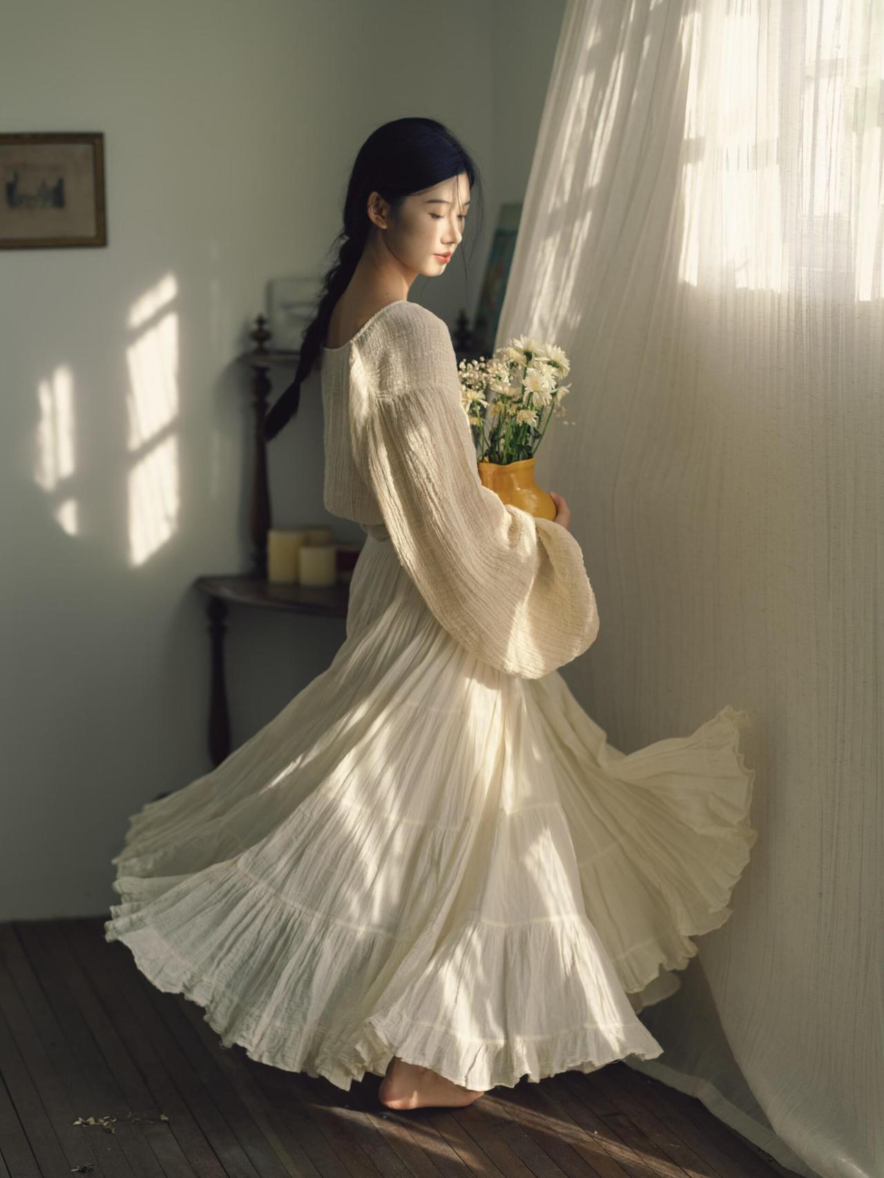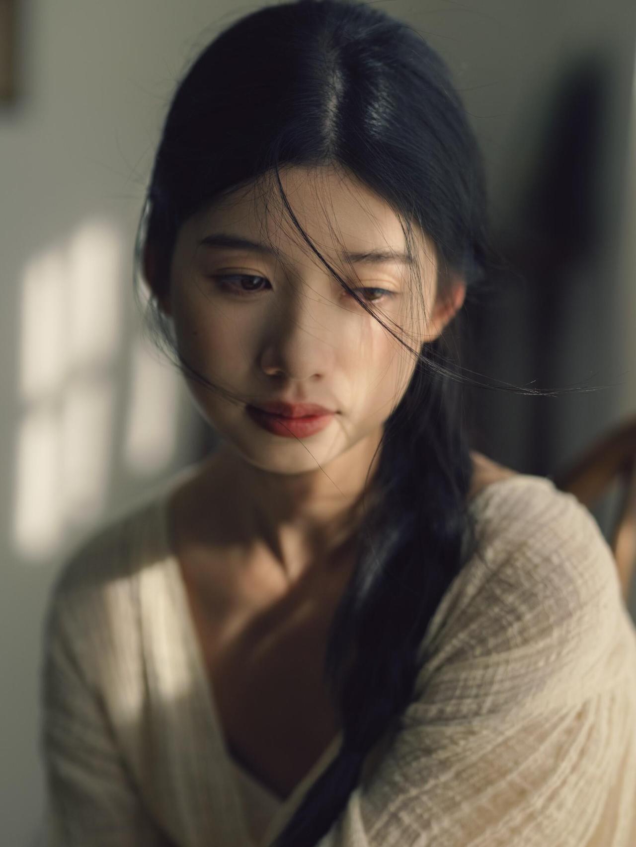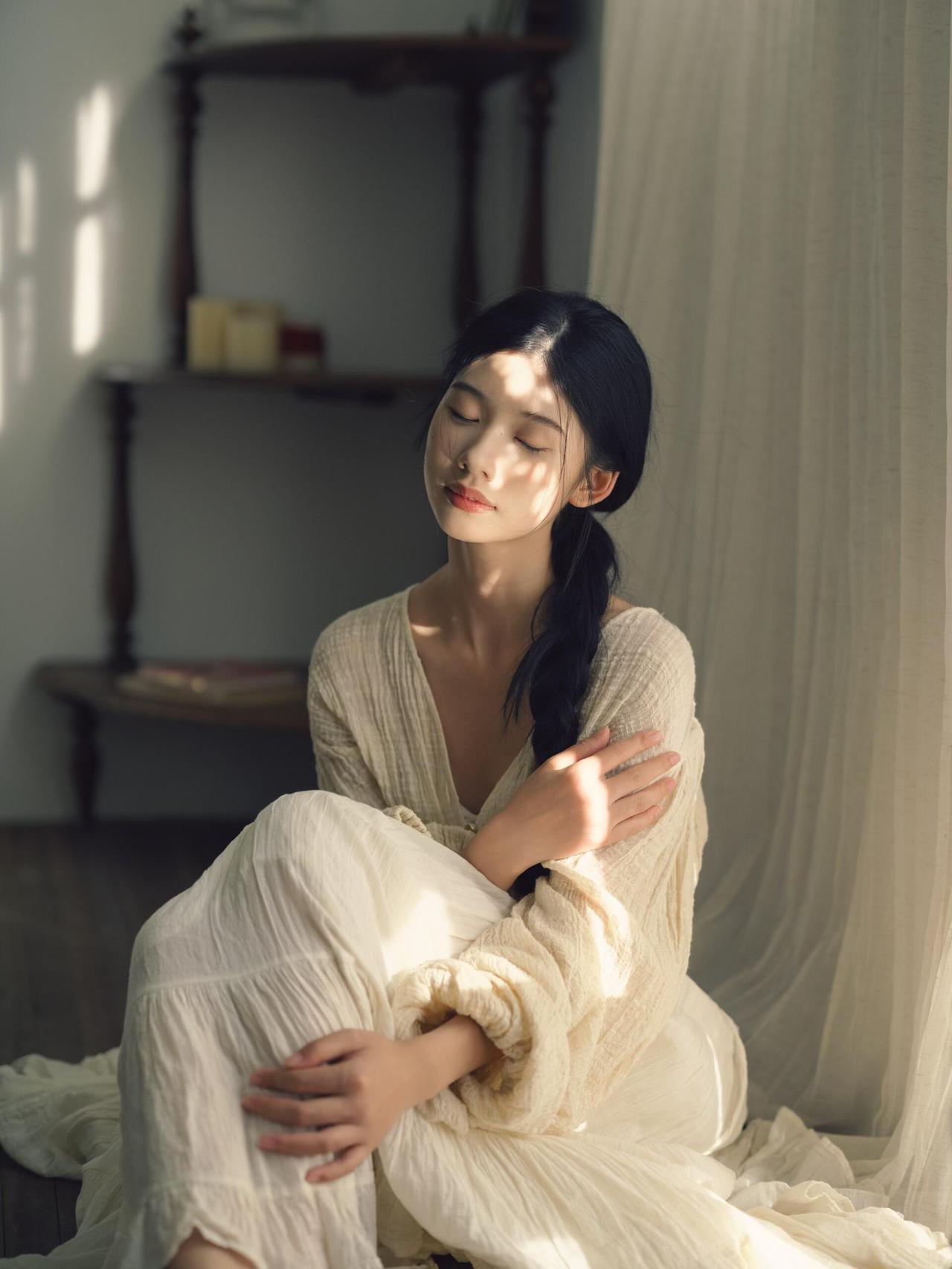 这组人像摄影画面中,米白色的服饰材质选择极具巧思,肌理褶皱如时光的纹路,与木质家具、薄透窗帘的质感形成温柔呼应。光线是当之无愧的灵魂笔触,它以“缝隙式”的姿态介入——透过窗帘的缝隙、在墙面切割出的光斑、在发丝与衣摆处晕染的轮廓光,都让画面有了呼吸感。这种光影处理,既保留了室内空间的静谧纵深,又让人物成为了光影的容器,每一寸光斑都是时光驻足的痕迹。 道具的运用更是点睛之笔。粉色百合的明艳、白色小菊的素雅、透明玻璃瓶与黄色花瓶的质感对比,在统一的静谧调性里制造出视觉与情绪的微澜,它们不再是单纯的陪衬,而是成为了“时光”的具象化符号,与人物的姿态、神情共同编织出一段关于静思、关于独处的叙事。