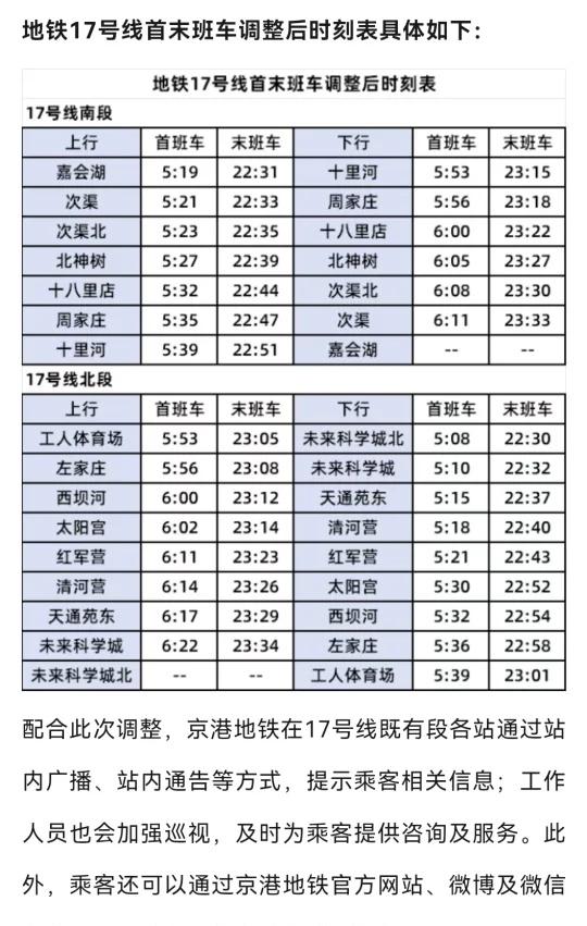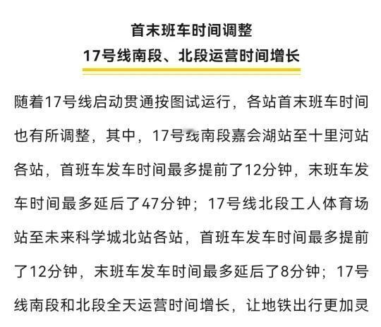 北京地铁17号线贯通试运行 出行更更更方便了[赞][赞][赞] 今起,京港地铁17号线全线(嘉会湖站-未来科学城北站)启动贯通按图试运行。试运行期间,载客段为17号线既有段,即南段(嘉会湖站-十里河站)和北段(工人体育场站-未来科学城北站),非载客段为17号线中段(十里河站-工人体育场站)。自贯通按图试运行起,17号线既有段工作日晚高峰行车间隔及首末班车时间均有所调整,以方便乘客出行。 北京 轨道交通 城市交通规划 地铁