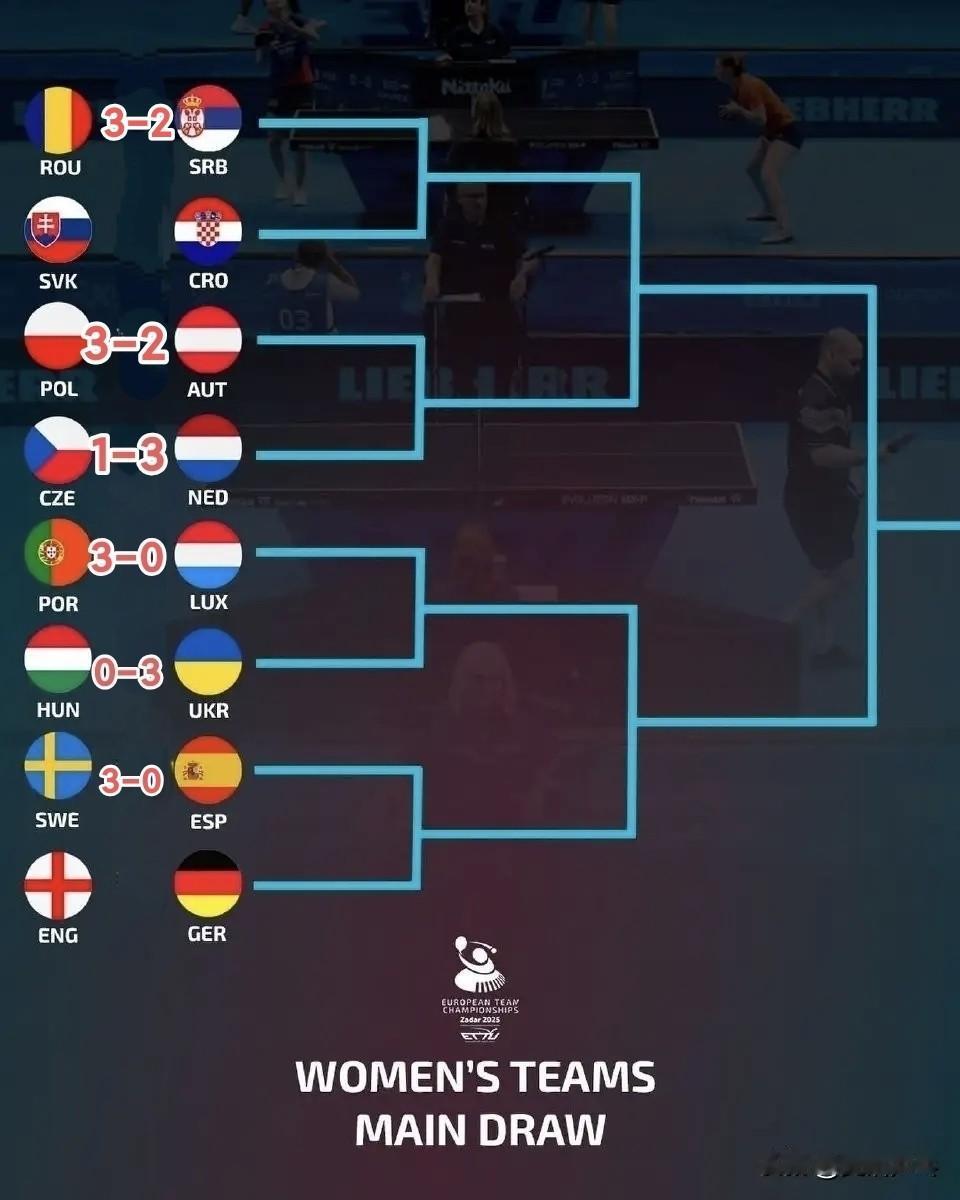 2025欧洲乒乓球团体锦标赛 一、男团1/8决赛:10.16 【🇭🇷克罗地亚3-2希腊🇬🇷】22:00 T1 第一盘:托米斯拉夫·普卡3-0乔治斯·斯塔马图罗斯 【11-6,11-9,11-9】 第二盘:安德烈·加奇尼3-1帕纳约蒂斯·吉奥尼斯 【11-7,12-10,10-12,12-10】 第三盘:伊沃·本2-3康斯坦丁诺斯·康斯坦丁诺普洛斯 【9-11,11-8,9-11,12-10,2-11】 第四盘:托米斯拉夫·普卡1-3帕纳约蒂斯·吉奥尼斯 【11-7,12-14,3-11,11-13】 第五盘:安德烈·加奇尼3-1乔治斯·斯塔马图罗斯 【8-11,11-4,11-7,11-8】 【🇧🇪比利时3-0土耳其🇹🇷】22:00 T4 第一盘:阿德里安·拉森福斯3-0阿卜杜拉·伊根勒 【11-4,11-4,11-4】 第二盘:塞德里克·努伊提克3-2易卜拉欣·贡杜兹 【11-6,8-11,10-12,11-7,11-5】 第三盘:马丁·阿莱格罗3-0乌古尔坎·杜尔松 【11-7,12-10,12-10】 第四盘:阿德里安·拉森福斯🆚易卜拉欣·贡杜兹 第五盘:塞德里克·努伊提克🆚阿卜杜拉·伊根勒 二、女团1/8决赛:10.16 【🇷🇸塞尔维亚2-3罗马尼亚🇷🇴】22:00 T2 第一盘:萨拜娜·苏尔詹3-2安德烈娅·德拉戈曼 【5-11,11-5,7-11,11-6,12-10】 第二盘:阿内塔·马克苏蒂1-3伯纳黛特·斯佐科斯 【11-6,4-11,4-11,8-11】 第三盘:伊萨贝拉·卢普雷斯库3-2伊丽莎贝塔·萨马拉 【11-13,11-8,5-11,13-11,11-5】 第四盘:萨拜娜·苏尔詹0-3伯纳黛特·斯佐科斯 【9-11,11-13,9-11】 第五盘:阿内塔·马克苏蒂2-3安德烈娅·德拉戈曼 【8-11,11-8,4-11,12-10,6-11】 【🇪🇸西班牙0-3瑞典🇸🇪】22:00 T3 第一盘:肖瑶茜0-3琳达·伯格斯特隆 【10-12,5-11,7-11】 第二盘:张璇0-3克里斯蒂娜·卡尔伯格 【12-14,8-11,9-11】 第三盘:埃尔维拉·拉德2-3菲利帕·博嘉德 【8-11,11-8,4-11,11-7,9-11】 第四盘:肖瑶茜🆚克里斯蒂娜·卡尔伯格 第五盘:张璇🆚琳达·伯格斯特隆